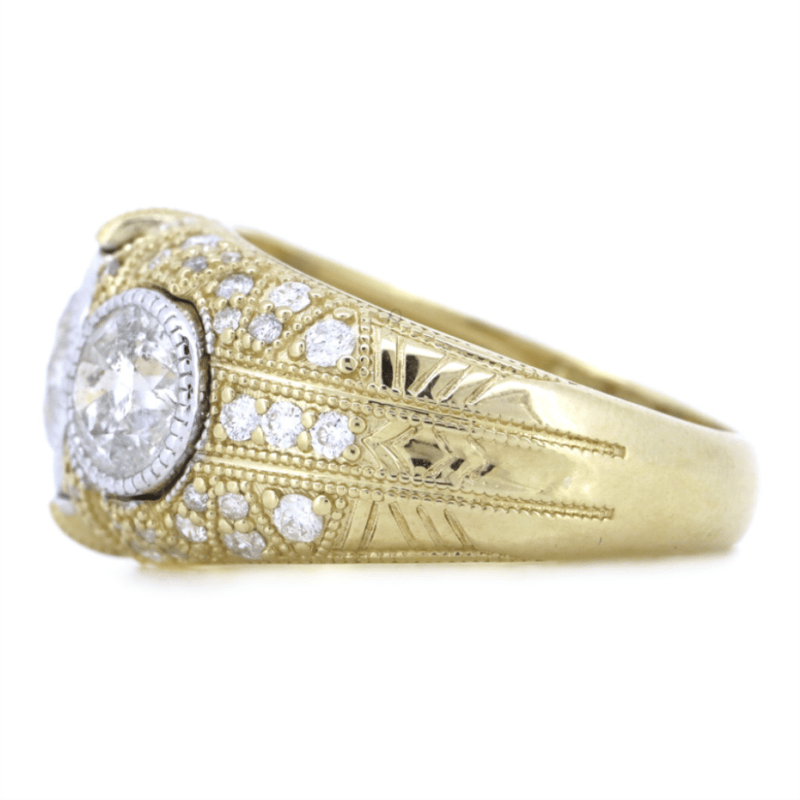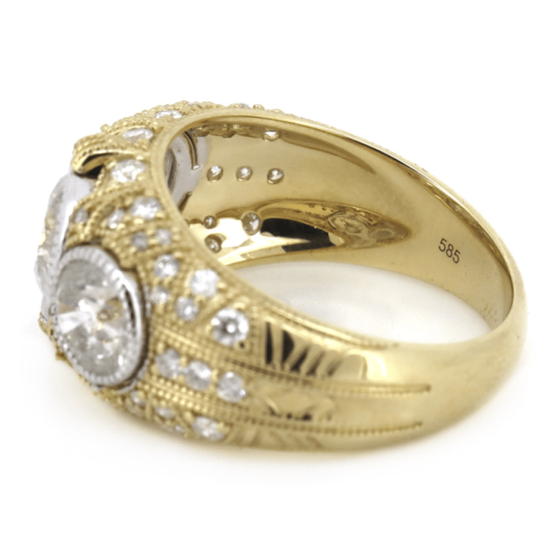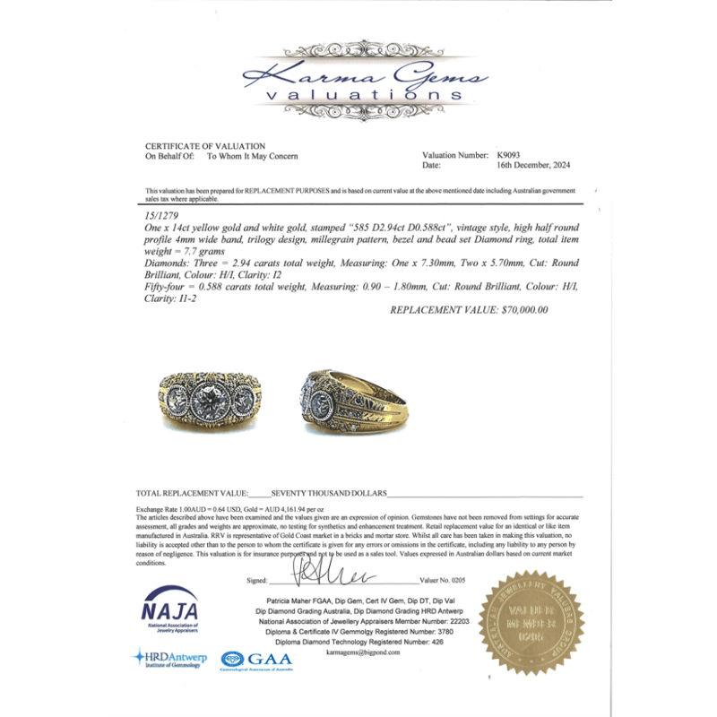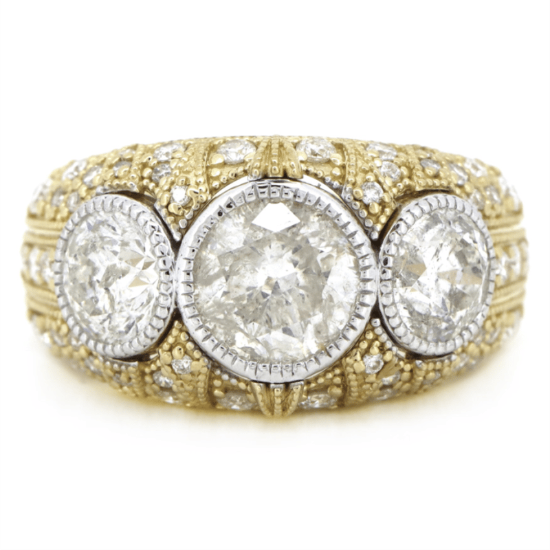 The Central Design Features, 3 Round Brilliant Cut, Diamonds (2.94Ct Tdw, H-I Colour, I2 Clarity), Bezel Set In White Gold With Millegrain Detail. Encompassing The Design Are, 50 Round Brilliant Cut, Diamonds (0.588Ct Tdw, H I Colour, I1-2 Clarity), Micro-Bead Set. Ring Size P.
