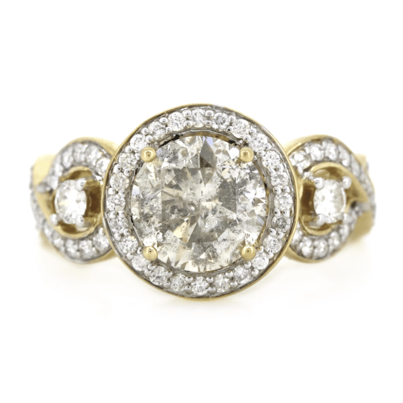 The Centre Features, One Round Brilliant Cut, Diamond (2.02Ct, K-L Colour, Salt & Pepper Clarity), 4 Claw Set. Decorating The Shoulders And Embellishing The Design Are, 74 Round Brilliant Cut, Diamonds (0.56Ct Tdw, G-H Colour, Si1-Si2 Clarity), 4 Claw Set. Ring Size O 1/2.