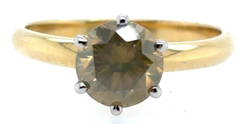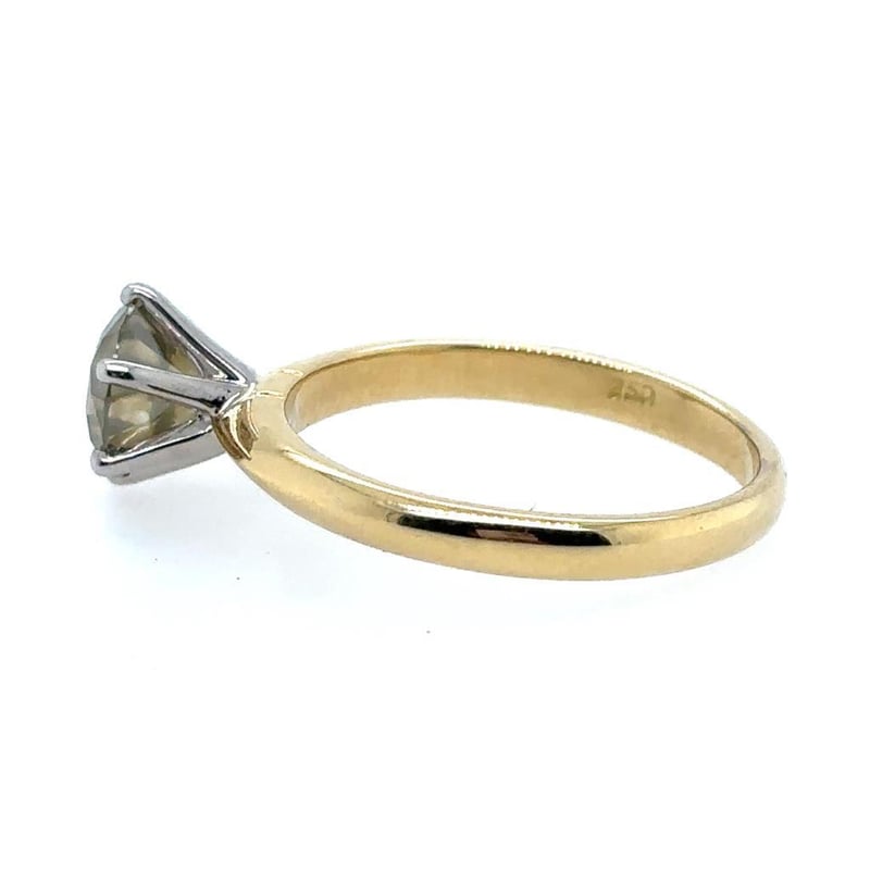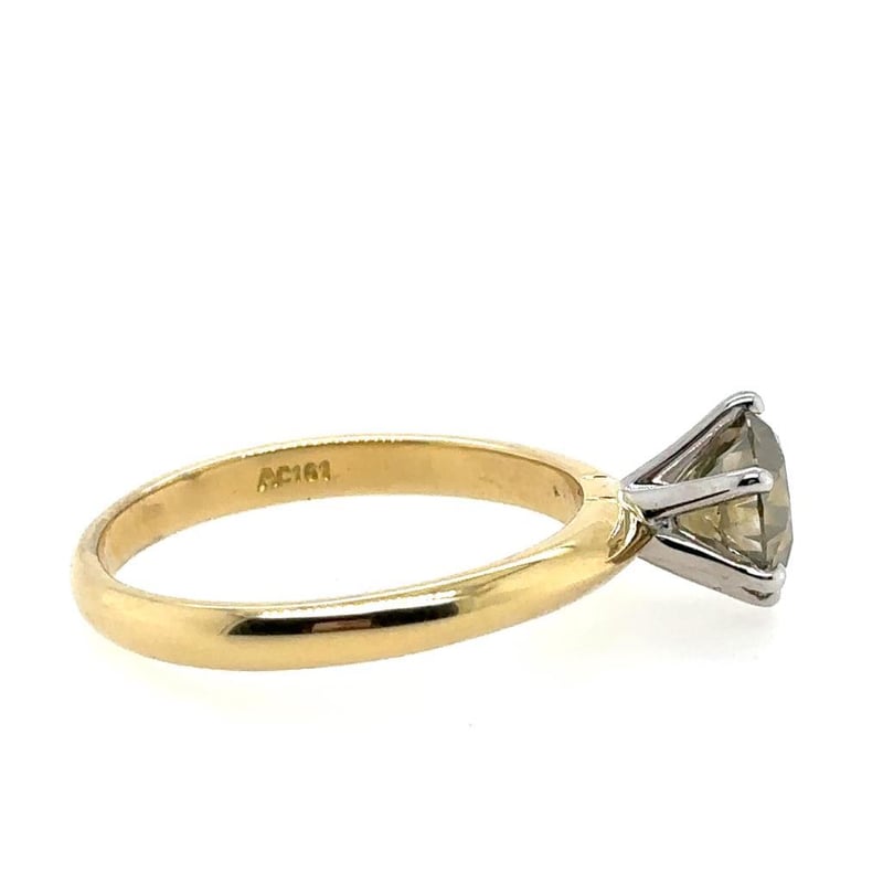 This 18Ct Yellow & White Gold Ring Features 1 X 1.64Ct Round Brilliant Cut Claw Set Diamond, Measuring 7.4Mm, Clarity: Si2, Colour: Fancy Yellow Brown.
