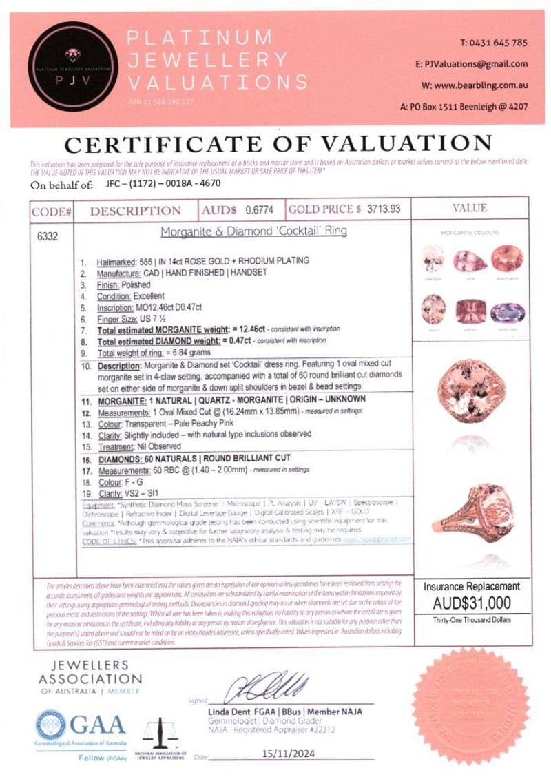 Featuring Centre, One Oval Cut, Pale Peachy Pink Morganite (12.46Ct, Slightly Included), Claw Set, With 60 Round Brilliant Cut Diamonds (0.47Ct Tdw, F-G Colour, Vs2-Si1 Clarity), Bezel/Bead Set. Ring Size O.