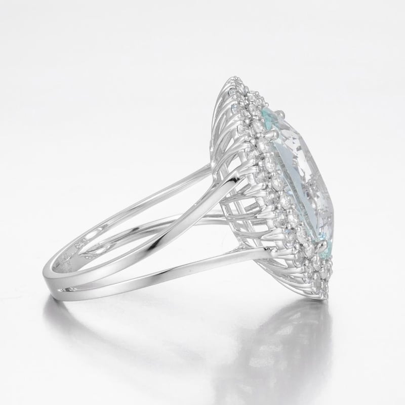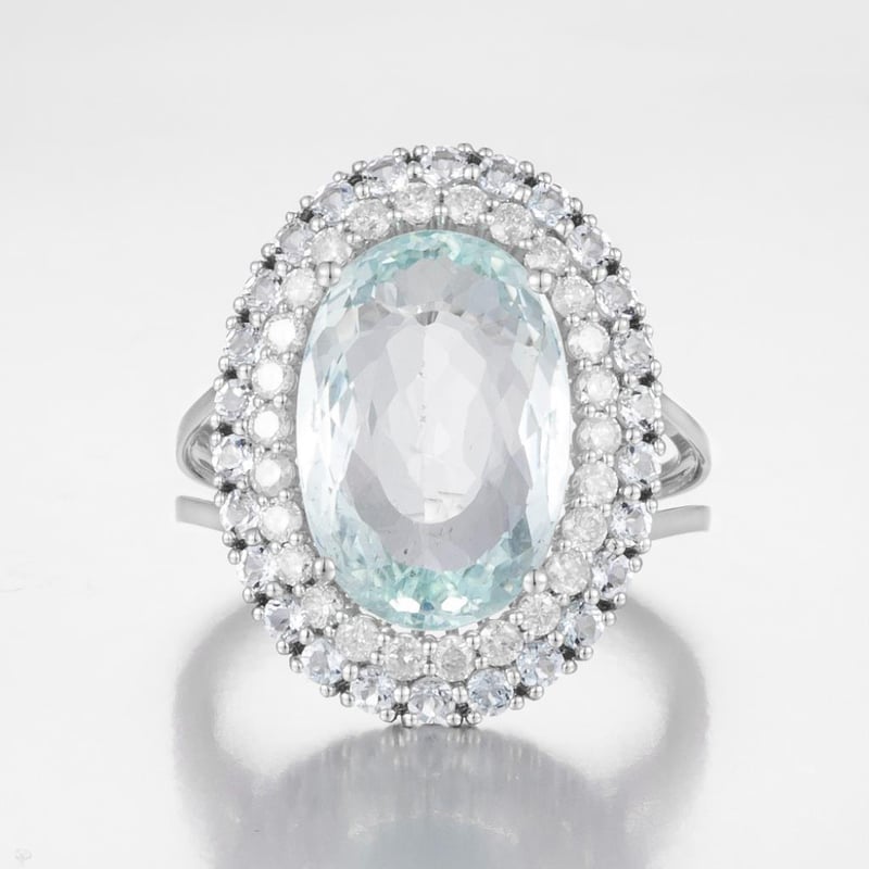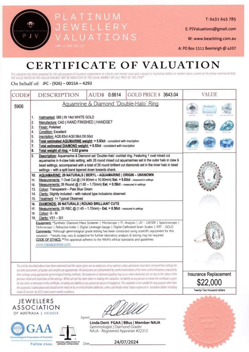 14CT WHITE GOLD AQUAMARINE AND DIAMOND COCKTAIL RING Featuring Centre, One Oval Cut, Pale Blue-Green Aquamarine (5.83Ct, Slightly Included), Claw Set, With 26 Round Brilliant Cut Diamonds (0.50Ct Tdw, G-M Colour, Vs1-Si1 Clarity), Bead Set, And 26 Round Cut, Pale Blue-Green Aquamarines (0.58Ct Tsw, Slightly Included), Bead Set. Ring Size O. Valuations Provided by an Independent Third-Party Professional Not Directly Associated With Lloyds Auctions at AUD $22000This valuation has been conducted by an independent third-party professional. The valuation amount is an assessment by the issuing valuer and does not reflect the auction value of the item. Any inquiries regarding the valuation should be directed to the issuing valuer (refer to contact details on the certificate), as Lloyds Auctions has no affiliation or influence over the valuation, the valuer, or the stated amount. Condition: Good - Refer Images 0586379+631