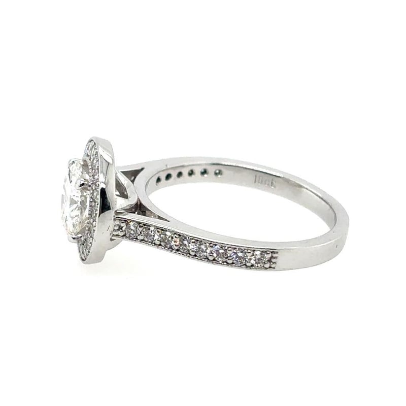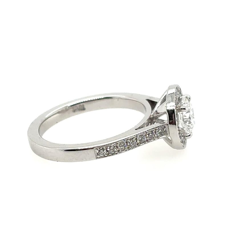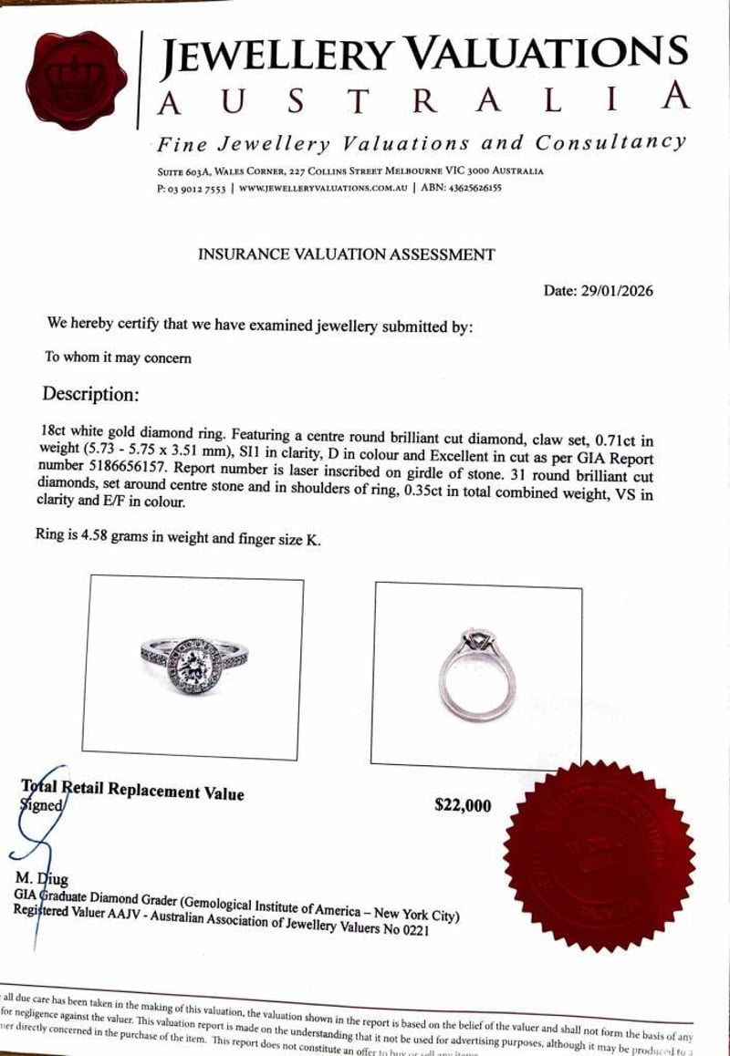 Featuring A Centre Round Brilliant Cut Diamond, Claw Set, 0.71Ct In Weight (5.73-5.75 X 3.51 Mm), Si1 In Clarity, D In Colour And Excellent In Cut As Per Gia Report Number 5186656157. Report Number Is Laser Inscribed On Girdle Of Stone. 31 Round Brilliant Cut Diamonds, Set Around Centre Stone And In Shoulders Of Ring, 0.35Ct In Total Combined Weight, Vs In Clarity And E/F In Colour.
