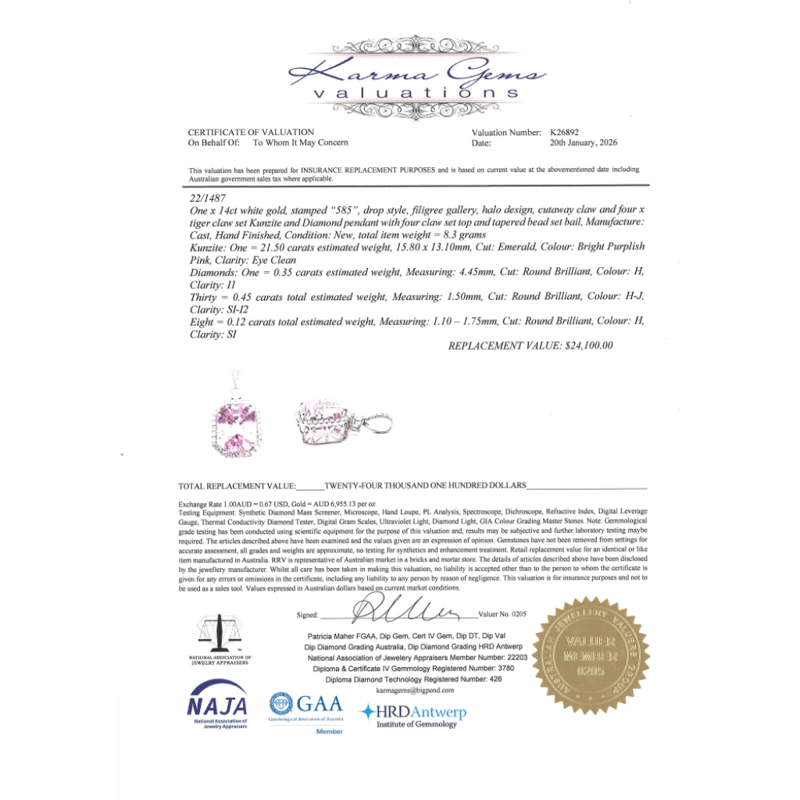 14K WHITE GOLD, KUNZITE AND DIAMOND, HALO STATEMENT PENDANT. The Centre Features, One Emerald Cut, Bright Pink, Kunzite (21.50Ct, Eye Clean Clarity), 4 Claw Set. Surrounding The Centre In A Halo Are, 30 Round Brilliant Cut, Diamonds (0.45Ct Tdw, H-J Colour, Si-I2 Clarity), Micro-Claw Set. Surmounted By, One Round Brilliant Cut, Diamond (0.35Ct, H Colour, I1 Clarity), 4 Claw Set. Decorating The Bail Are, 8 Round Brilliant Cut, Diamonds (0.12Ct Tdw, H Colour, Si Clarity), Claw Set. The Basket Features A Filigree Design. Valuations Provided by an Independent Third-Party Professional Not Directly Associated With Lloyds Auctions at AUD $$24,100.00This valuation has been conducted by an independent third-party professional. The valuation amount is an assessment by the issuing valuer and does not reflect the auction value of the item. Any inquiries regarding the valuation should be directed to the issuing valuer (refer to contact details on the certificate), as Lloyds Auctions has no affiliation or influence over the valuation, the valuer, or the stated amount. 0645926+5307