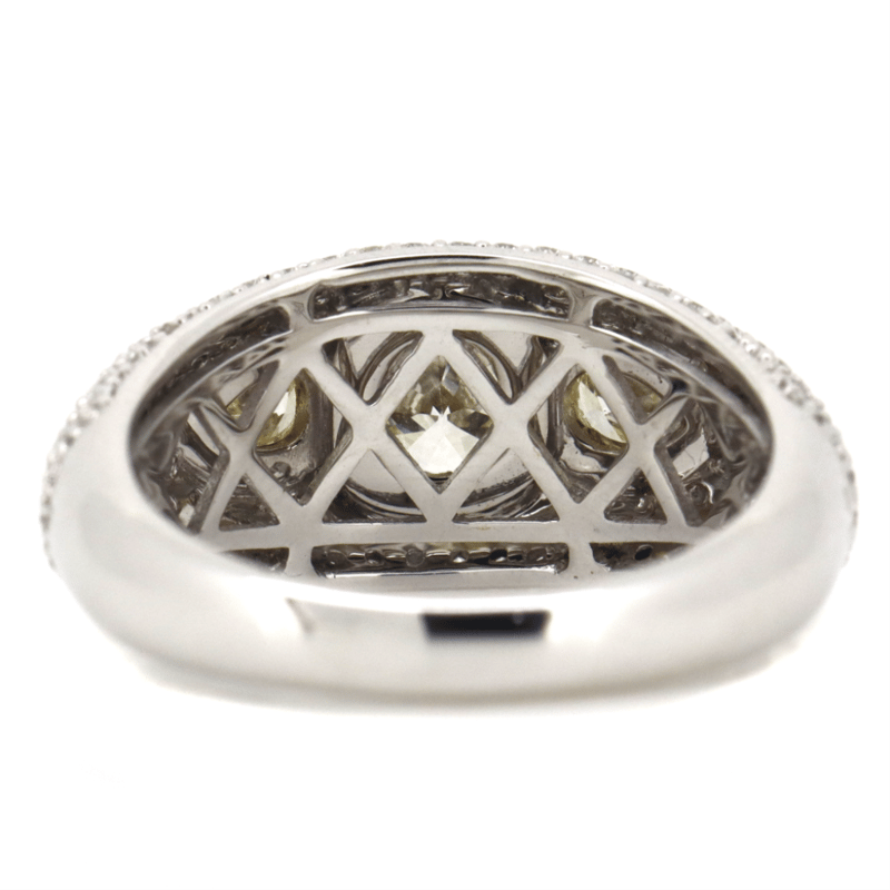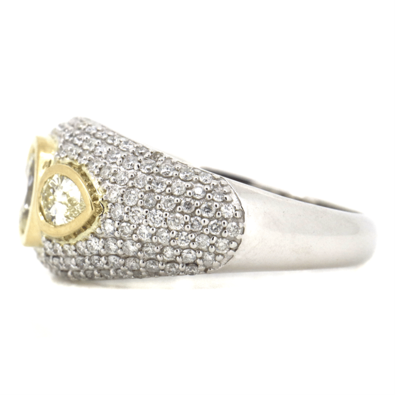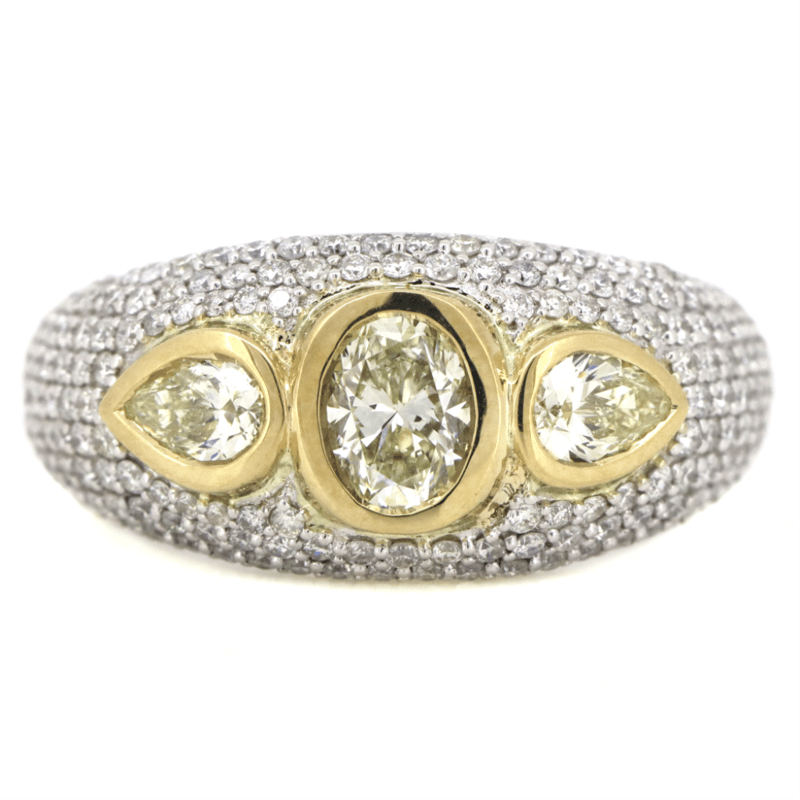 The Centre Features, One Modified Oval Cut, Fancy Yellow Diamond (0.48Ct, Si1-Si2 Clarity), Bezel Set. Flanking The Centre Diamond Are, 2 Pear Faceted Cut, Fancy Yellow Diamonds (0.38Ct Tdw, Si1-Si2 Clarity), Bezel Set. Encompassing The Centre In A Cluster Are, 168 Round Brilliant Cut, Diamonds (0.72Ct Tdw, G-H Colour, Si1-Si2 Clarity), Micro-Pave Set. Ring Size L 1/2.