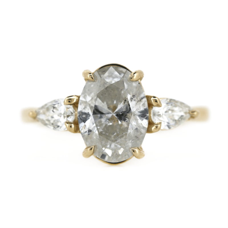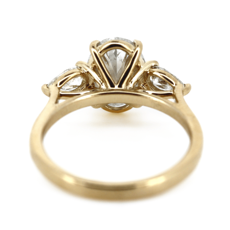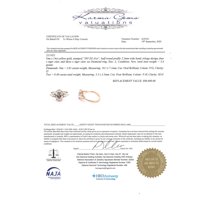 14K YELLOW GOLD AND DIAMOND, TRILOGY RING. The Centre Features, One Oval Brilliant Cut, Diamonds (2.01Ct, F-G Colour, I2 Clarity), 4 Claw Set. Accompanied By, 2 Pear Brilliant Cut, Diamonds (0.40Ct Tdw, F-H Colour, Si-I1 Clarity), Claw Set. Ring Size L 1/2. Valuations Provided by an Independent Third-Party Professional Not Directly Associated With Lloyds Auctions at AUD $$88,600.00This valuation has been conducted by an independent third-party professional. The valuation amount is an assessment by the issuing valuer and does not reflect the auction value of the item. Any inquiries regarding the valuation should be directed to the issuing valuer (refer to contact details on the certificate), as Lloyds Auctions has no affiliation or influence over the valuation, the valuer, or the stated amount. 0645926+5316