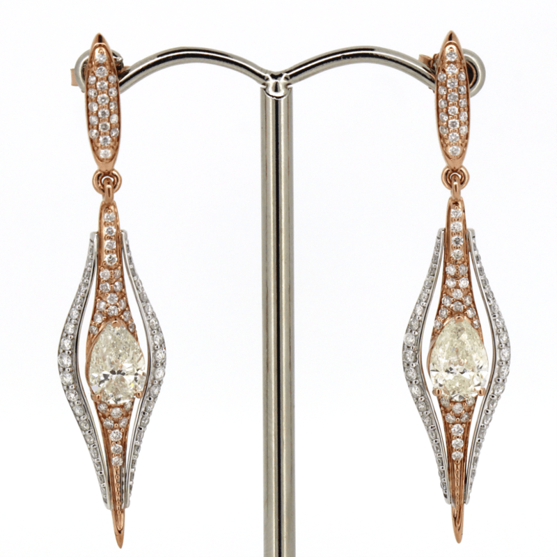 14K ROSE/WHITE GOLD AND DIAMOND, DROP EARRINGS. The Centres Feature, 2 Pear Cut, Diamonds (1.99Ct Tdw, I-J Colour, P2 Clarity), 4 Claw Basket Set. Decorating The Centre Are, 152 Round Brilliant Cut, Diamonds (1.00Ct Tdw, G-H Colour, Si1-Si2 Clarity), Bead Set. Valuations Provided by an Independent Third-Party Professional Not Directly Associated With Lloyds Auctions at AUD $$33,000.00This valuation has been conducted by an independent third-party professional. The valuation amount is an assessment by the issuing valuer and does not reflect the auction value of the item. Any inquiries regarding the valuation should be directed to the issuing valuer (refer to contact details on the certificate), as Lloyds Auctions has no affiliation or influence over the valuation, the valuer, or the stated amount. 0645926+5317