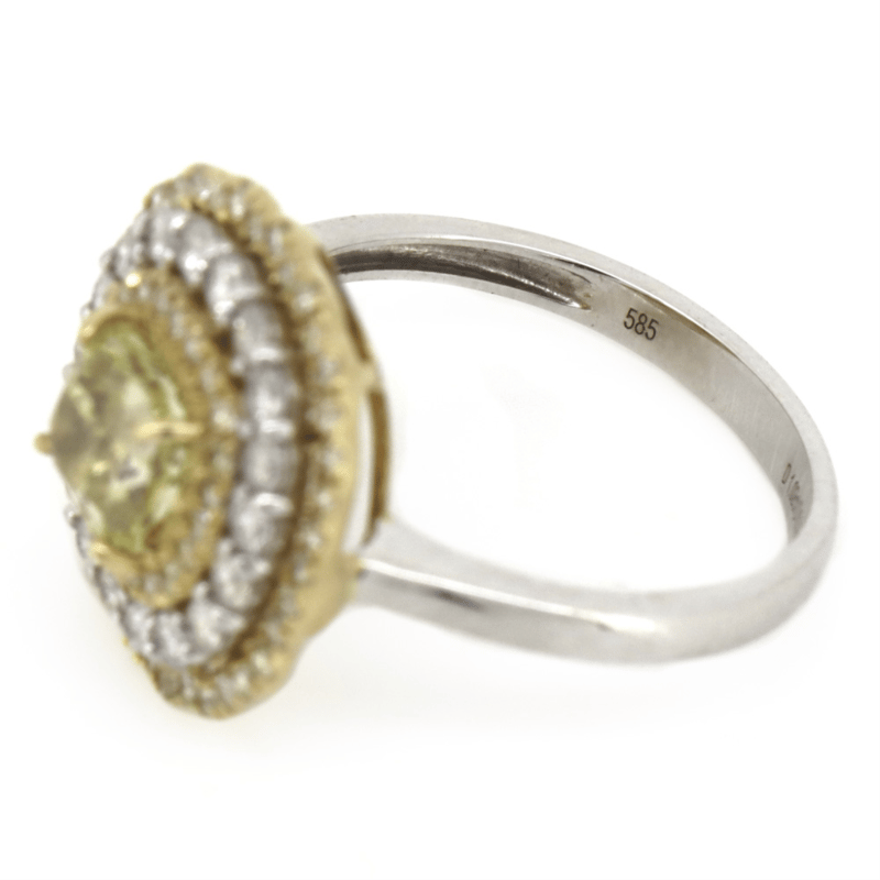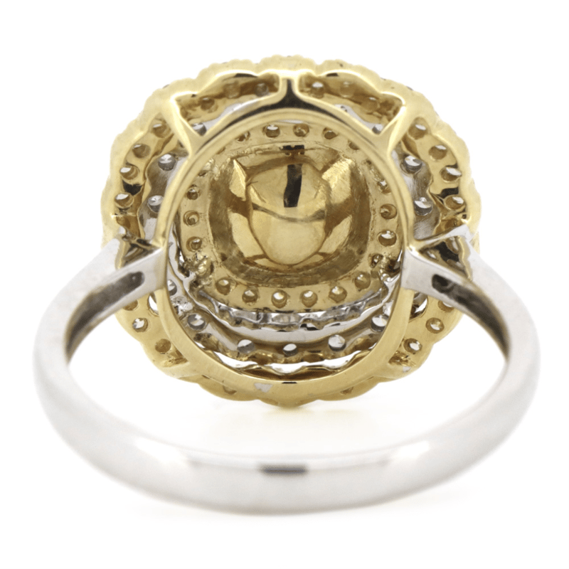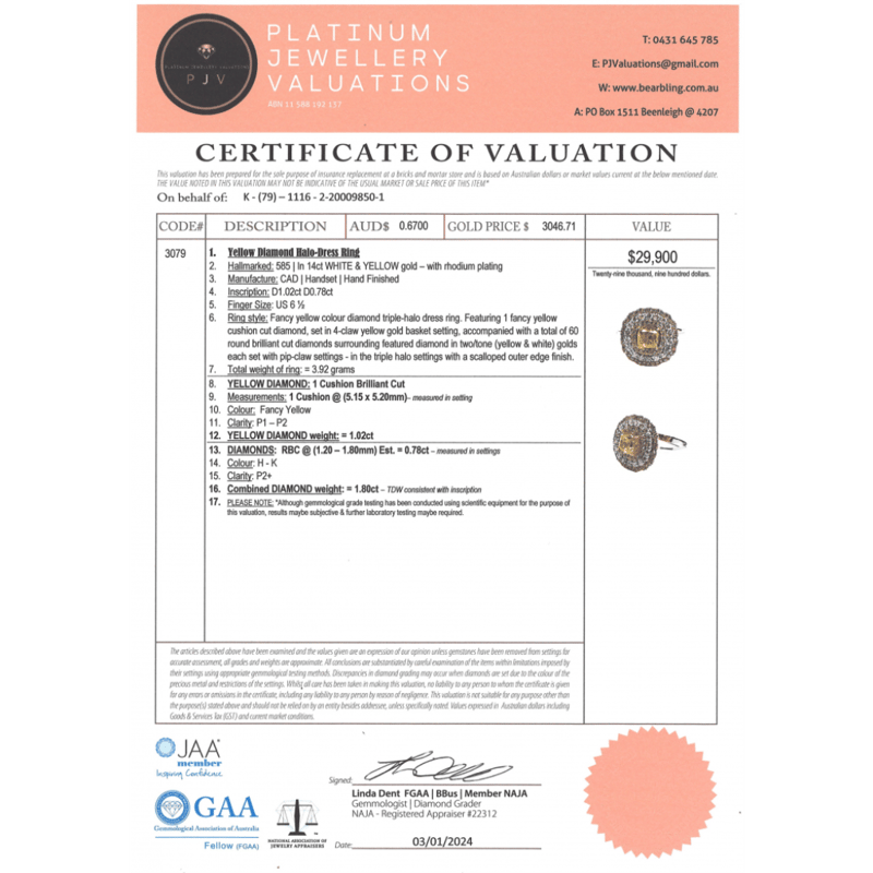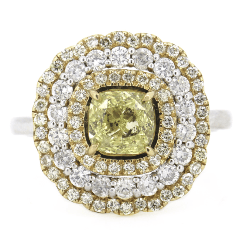 14K WHITE GOLD, FANCY YELLOW DIAMOND, TRIPLE HALO RING. The Centre Features, One Cushion Cut, Fancy Yellow, Diamond (1.02Ct, P1-P2 Clarity), 4 Claw Set In Yellow Gold. Surrounding The Centre In A Triple Halo Are, 60 Round Brilliant Cut, Diamonds (0.78Ct Tdw, H-K Colour, P2+ Clarity), Pip-Claw Set In Yellow/White Gold. Ring Size M. Valuations Provided by an Independent Third-Party Professional Not Directly Associated With Lloyds Auctions at AUD $$29,900.00This valuation has been conducted by an independent third-party professional. The valuation amount is an assessment by the issuing valuer and does not reflect the auction value of the item. Any inquiries regarding the valuation should be directed to the issuing valuer (refer to contact details on the certificate), as Lloyds Auctions has no affiliation or influence over the valuation, the valuer, or the stated amount. 0645926+5324