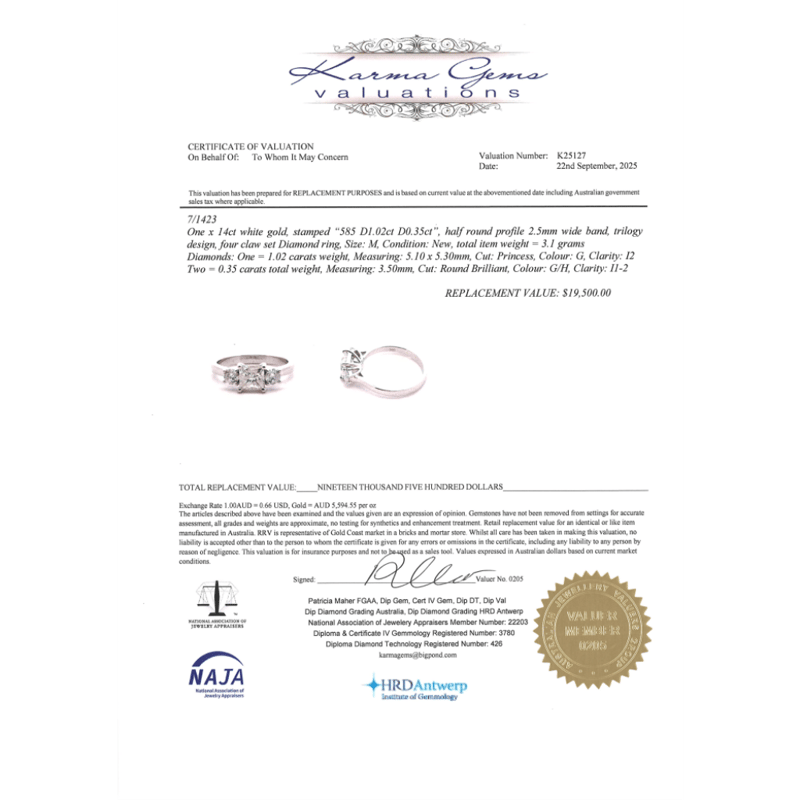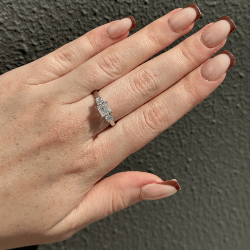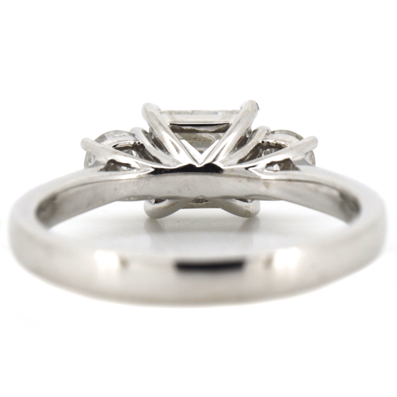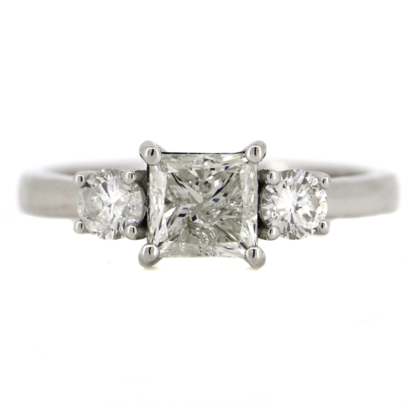 The Centre Features, One Princess Cut, Diamond (1.02Ct, G Colour, I2 Clarity), 4 Claw Set. Flanking Either Side Of The Centre Are, 2 Round Brilliant Cut, Diamonds (0.35Ct Tdw, G-H Colour, I1-I2 Clarity), 4 Claw Set. Ring Size M.