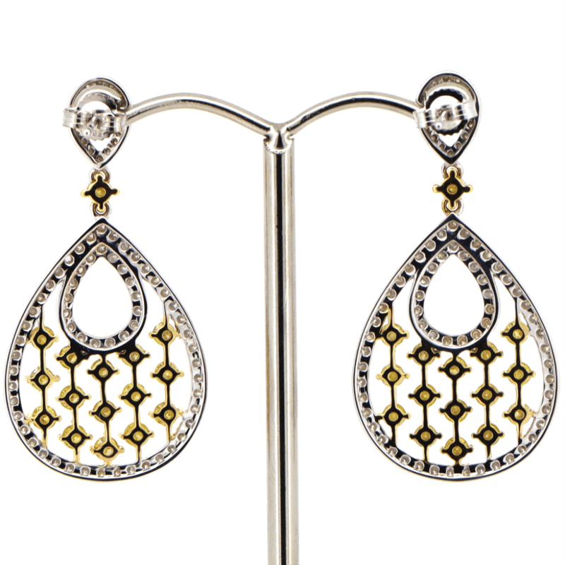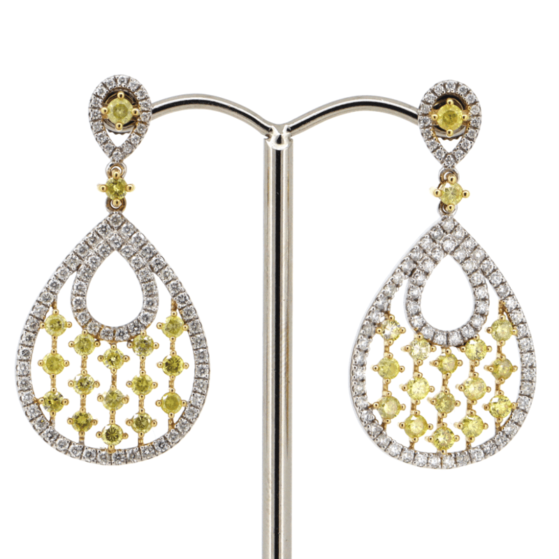 The Earrings Feature, 34 Round Brilliant Cut, Fancy Yellow, Diamonds (1.74Ct Tdw, Si1-I1 Clarity), 4 Claw Set In Yellow Gold. Decorating The Halos Are, 152 Round Brilliant Cut, Diamonds (1.24Ct Tdw, H-J Colour, Si-I1 Clarity), Claw Set. The Earrings Have Post-Backs, With 14K White Gold Butterfly Clasps.