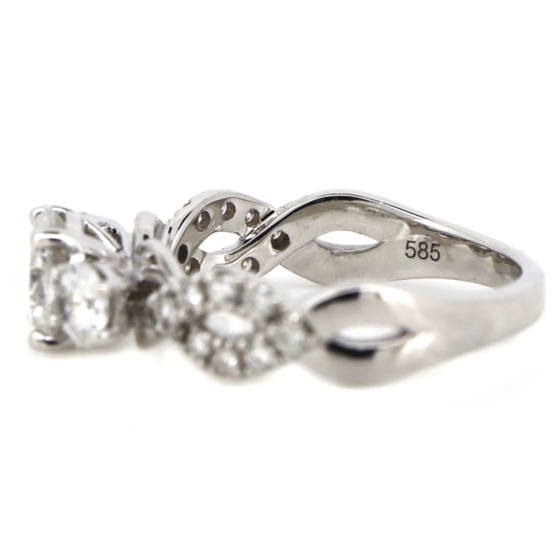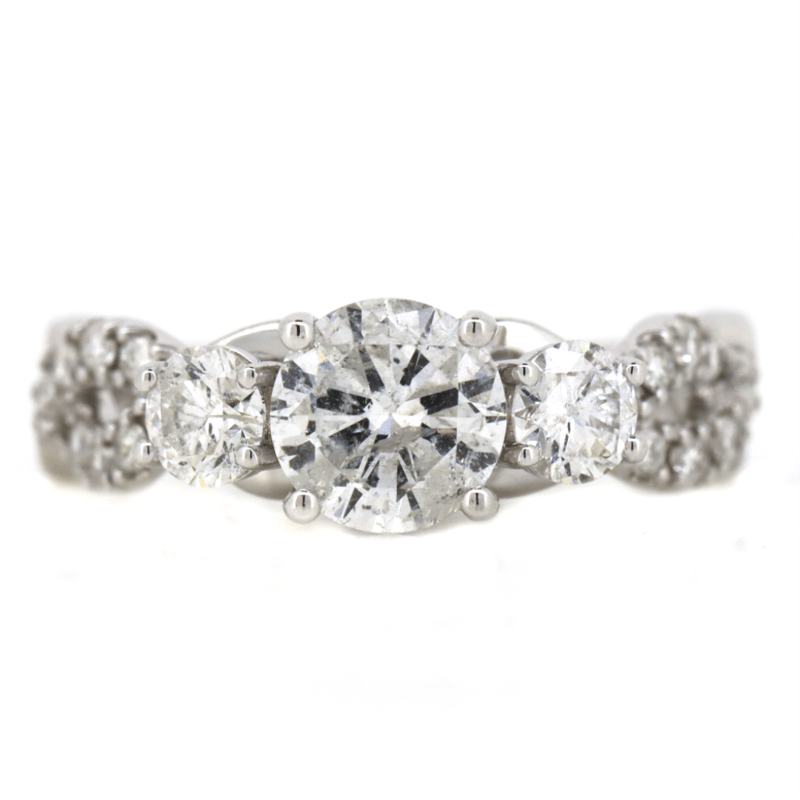 The Design Features, One Round Brilliant Cut, Diamond (1.07Ct, F Colour, I2 Clarity), Claw Set. Flanking The Centre Diamond Are, Two Round Brilliant Cut, Diamonds (0.42Ct Tdw, F Colour, I1-2 Clarity), Claw Set. Decorating The Twist Band Are, 16 Round Brilliant Cut, Diamonds (0.21Ct Tdw, F-G Colour, Si Clarity), Bead Set. Ring Size M 1/2.