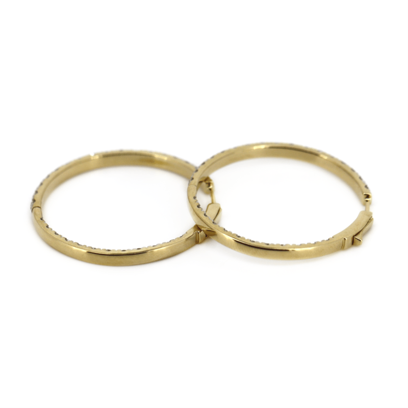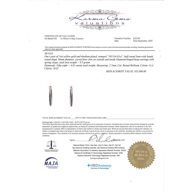 14K YELLOW GOLD AND 4.01CT TDW DIAMOND, HOOPS EARRINGS. The Design Features, 58 Round Brilliant Cut, Diamonds (4.01Ct Tdw, G-J Colour, Si-I2 Clarity), Bead Set. The Earrings Have Hinged Openings With Button Releases. Valuations Provided by an Independent Third-Party Professional Not Directly Associated With Lloyds Auctions at AUD $$52,000.00This valuation has been conducted by an independent third-party professional. The valuation amount is an assessment by the issuing valuer and does not reflect the auction value of the item. Any inquiries regarding the valuation should be directed to the issuing valuer (refer to contact details on the certificate), as Lloyds Auctions has no affiliation or influence over the valuation, the valuer, or the stated amount. 0645926+5334