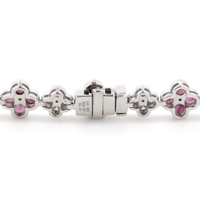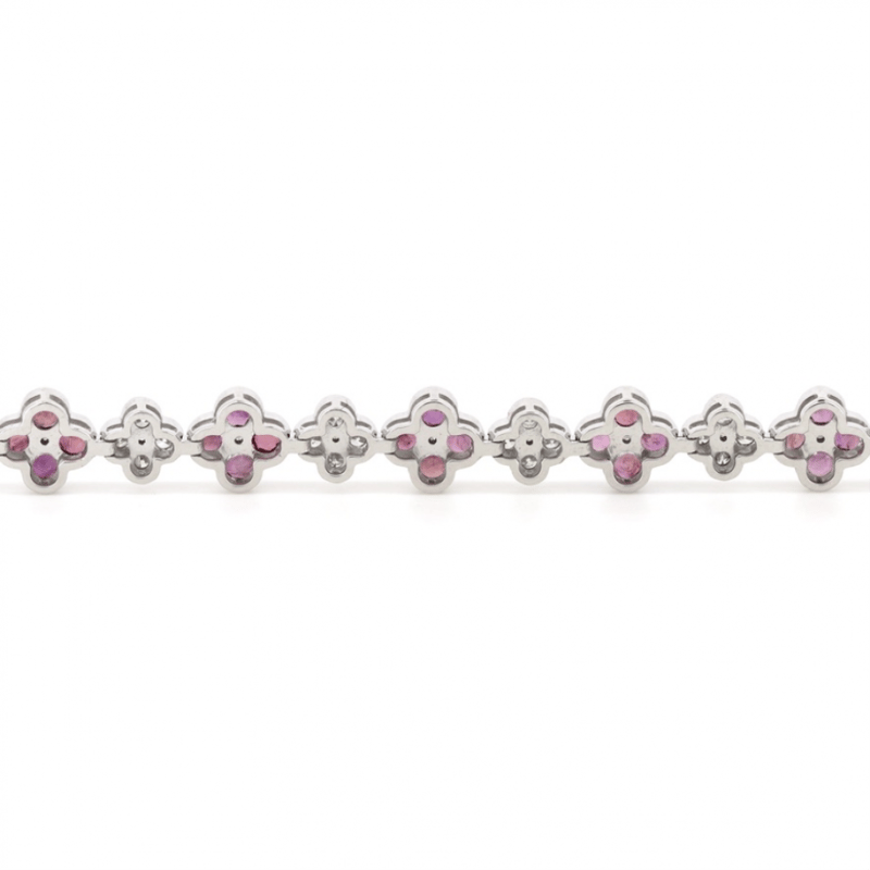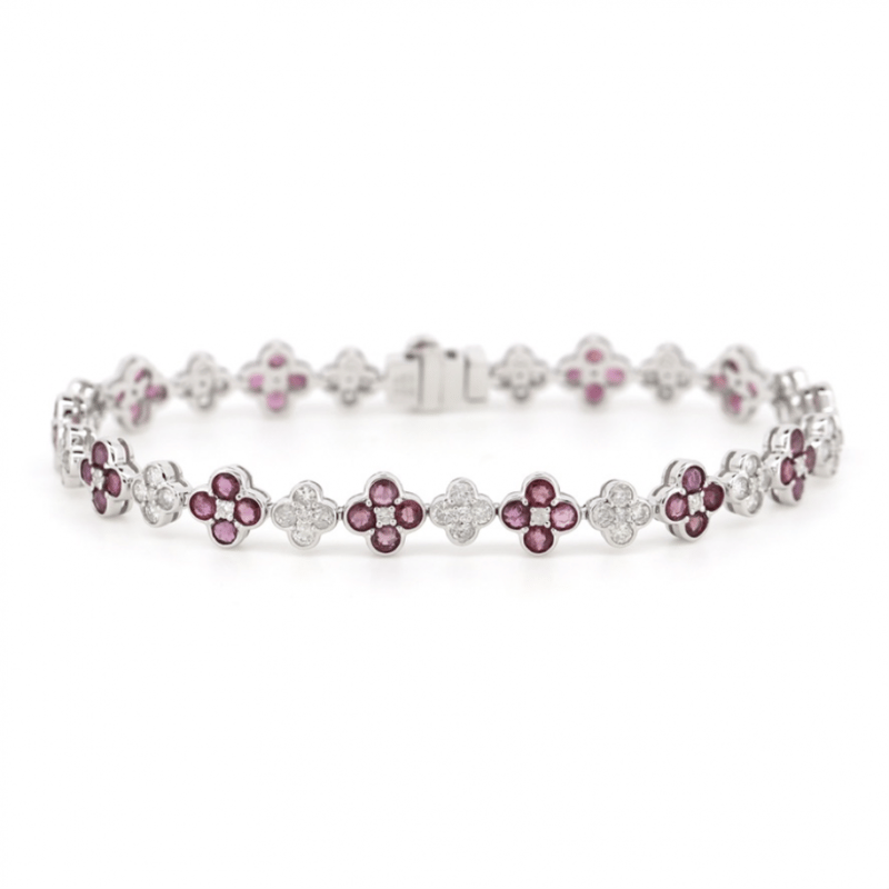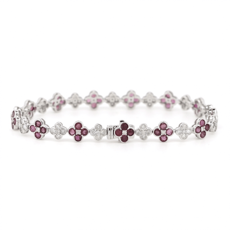 14K WHITE GOLD, RUBY AND DIAMOND, FLORAL BRACELET.