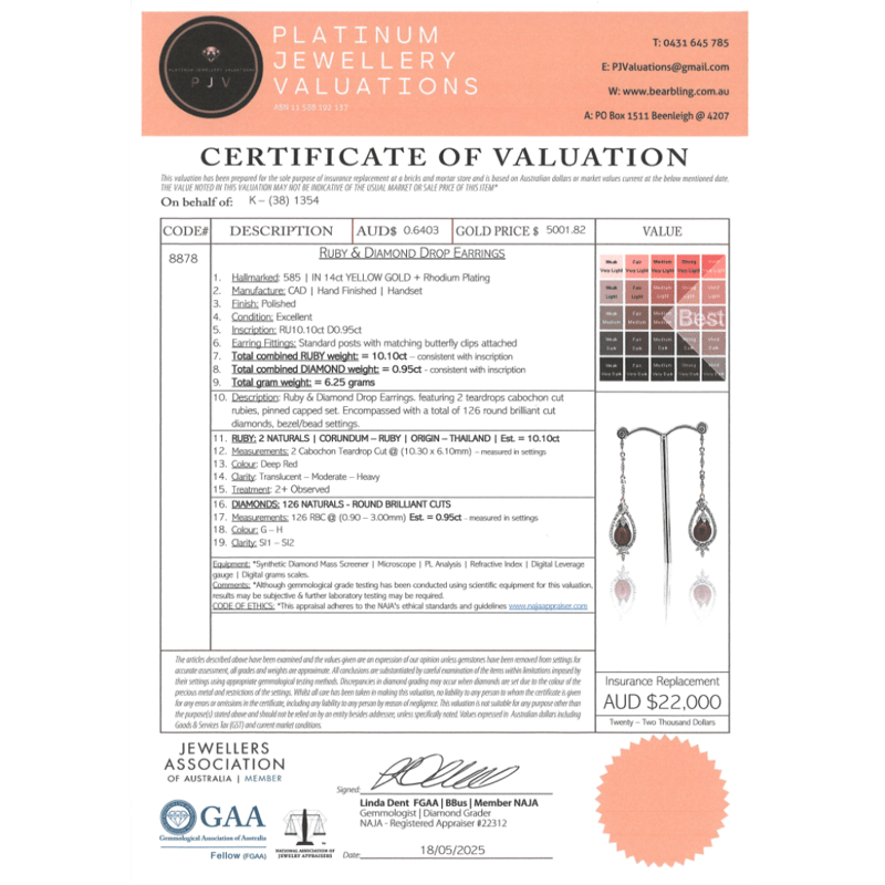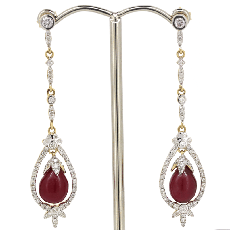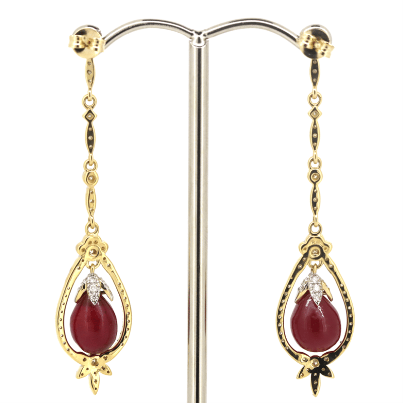 The Earrings Feature, 2 Cabochon Teardrop Cut, Deep Red, Rubies, (10.10Ct Tsw, Moderate-Heavy Inclusions), Claw Set. Encompassing The Design Are, 126 Round Brilliant Cut, Diamonds (0.95Ct Tdw, G-H Colour, Si1-Si2 Clarity), Micro Claw Set. Earrings Come With Butterfly Backs.