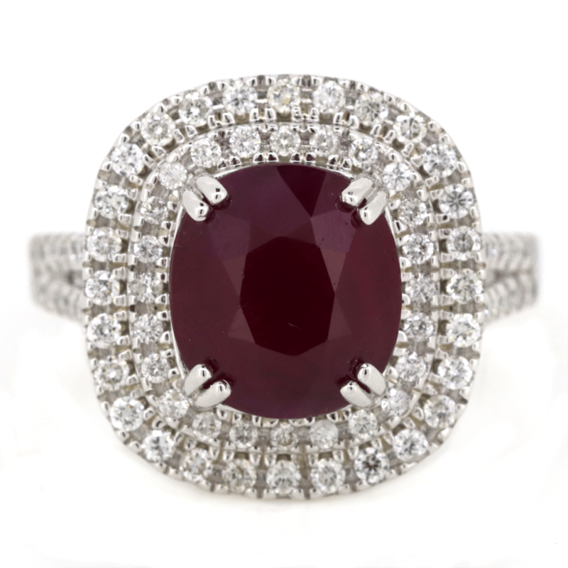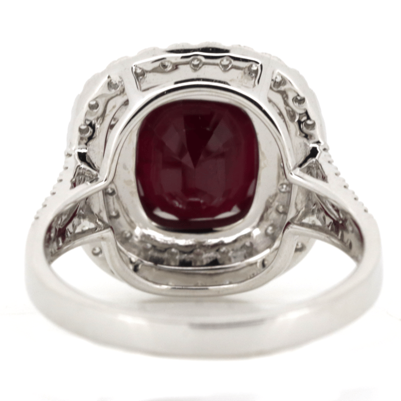 The Centre Features, One Cushion Cut, Ruby (4.00Ct, Moderate-Heavy Inclusions), Double Claw Set. Surrounding The Centre In A Double Halo And Decorating The Shoulders Are, 76 Round Brilliant Cut, Diamonds (0.47Ct Tdw, G-J Colour, Si-I2 Clarity), Micro-Claw Set In White Gold. Ring Size M.