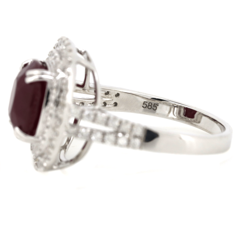 14K WHITE GOLD, RUBY AND DIAMOND, DOUBLE HALO RING.