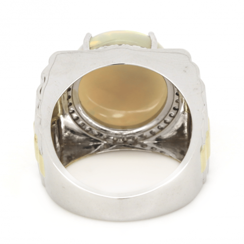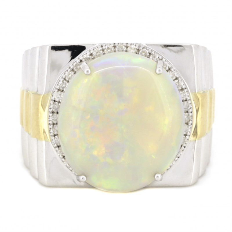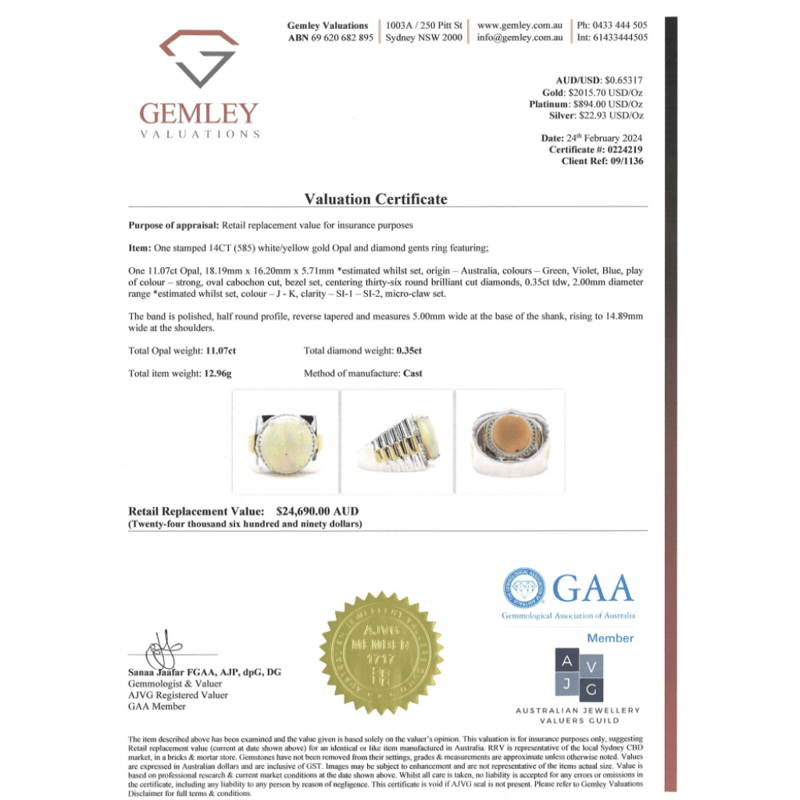 14K WHITE/YELLOW GOLD, 11.07CT AUSTRALIAN OPAL AND DIAMOND, STATEMENT RING. The Centre Features, One Oval Cabochon Cut, Australian Opal (11.07Ct, Green, Violet And Blue Strong Colour Play), 4 Claw Set. Surrounding The Centre In A Halo Are, 36 Round Brilliant Cut, Diamonds (0.35Ct Tdw, J-K Colour, Si1-Si2 Clarity), Micro-Claw Set. Ring Size T. Valuations Provided by an Independent Third-Party Professional Not Directly Associated With Lloyds Auctions at AUD $$24,690.00This valuation has been conducted by an independent third-party professional. The valuation amount is an assessment by the issuing valuer and does not reflect the auction value of the item. Any inquiries regarding the valuation should be directed to the issuing valuer (refer to contact details on the certificate), as Lloyds Auctions has no affiliation or influence over the valuation, the valuer, or the stated amount. 0645926+5348
