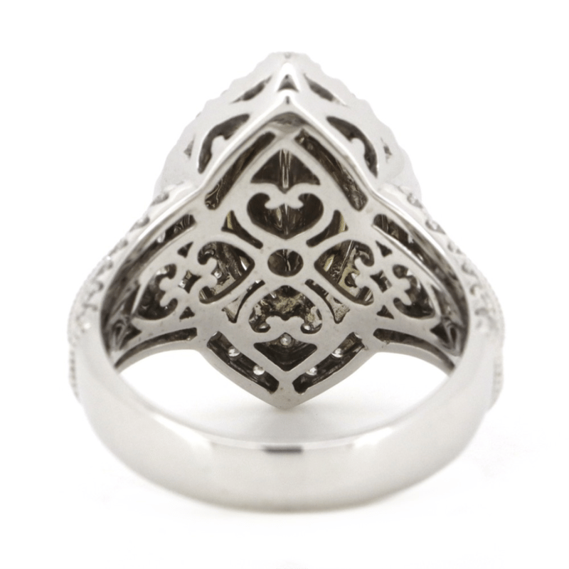 The Centre Features, One Modified Marquise Cut, Diamond (1.34Ct, G-H Colour, Vs1-Si1 Clarity), Claw Set In Yellow Gold. Surrounding The Centre In A Double Halo And Decorating The Band Are, 86 Round Brilliant Cut, Diamonds (1.69Ct Tdw, H-J Colour, P2+ Clarity), Bead/Pip-Claw Set. Ring Size O.