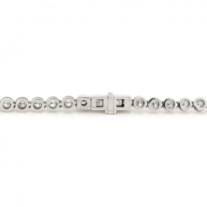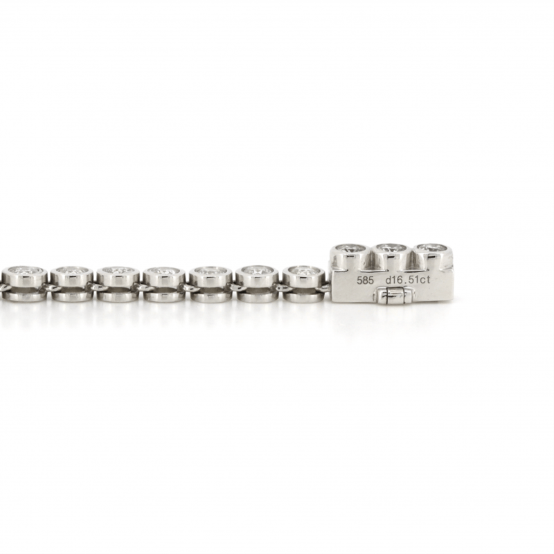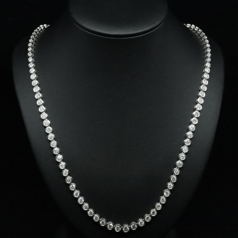 14K WHITE GOLD, 16.51CT TDW DIAMOND, RIVIERA NECKLACE. The Design Features, 103 Round Brilliant Cut, Diamonds (16.51Ct Tdw, G-I Colour, P1+ Clarity), Bezel Set. The Necklace Has Box Lock Clasp, With One Safety Latch. Necklace Length Is 50.5Cm. Valuations Provided by an Independent Third-Party Professional Not Directly Associated With Lloyds Auctions at AUD $$88,500.00This valuation has been conducted by an independent third-party professional. The valuation amount is an assessment by the issuing valuer and does not reflect the auction value of the item. Any inquiries regarding the valuation should be directed to the issuing valuer (refer to contact details on the certificate), as Lloyds Auctions has no affiliation or influence over the valuation, the valuer, or the stated amount. Condition: Good - Refer Images 0645940+5003