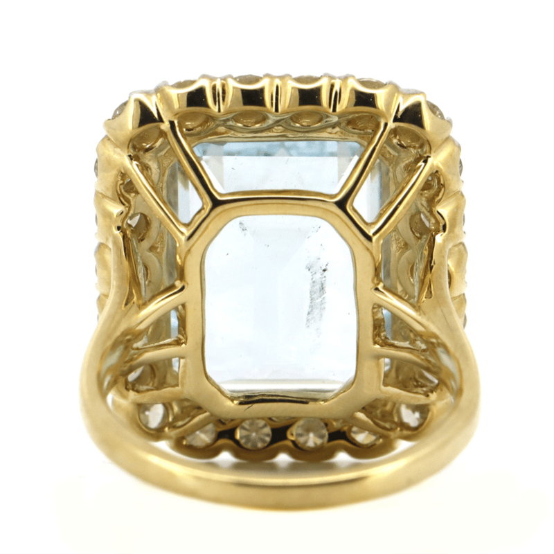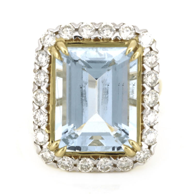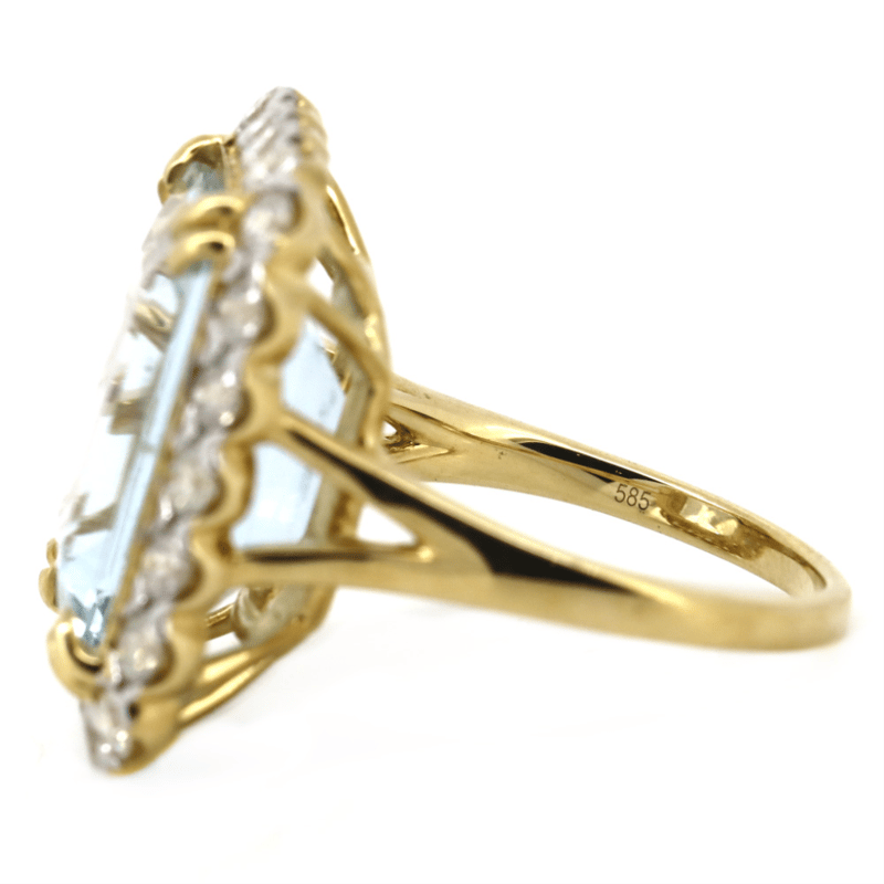 14K YELLOW GOLD, AQUAMARINE AND DIAMOND, HALO RING.