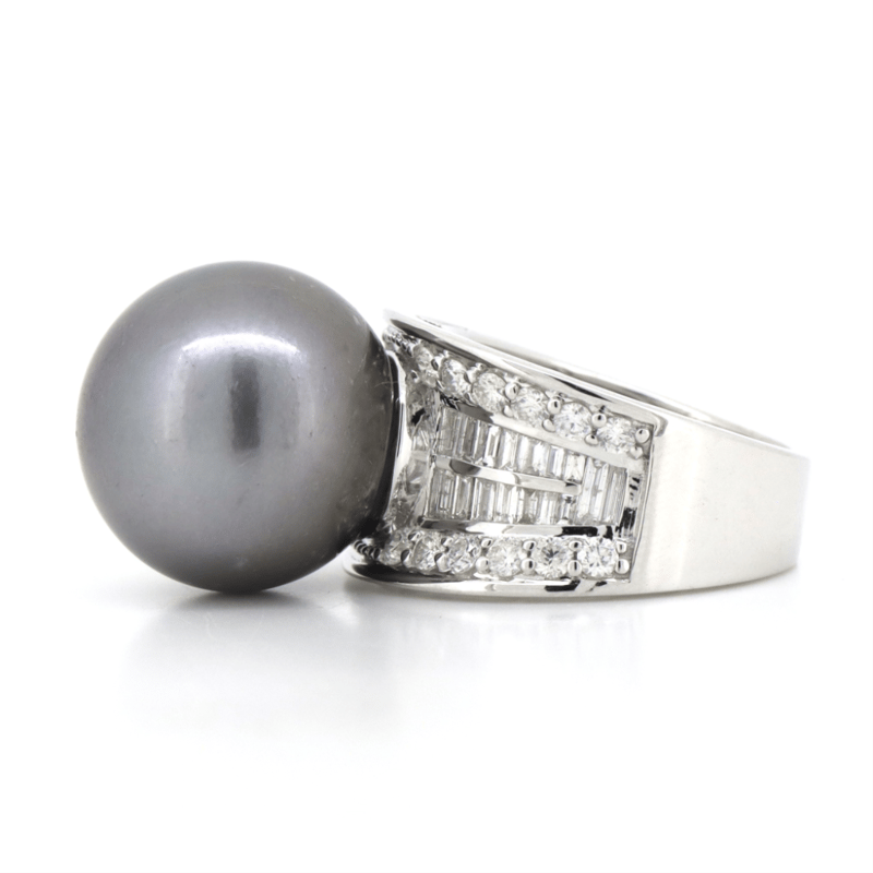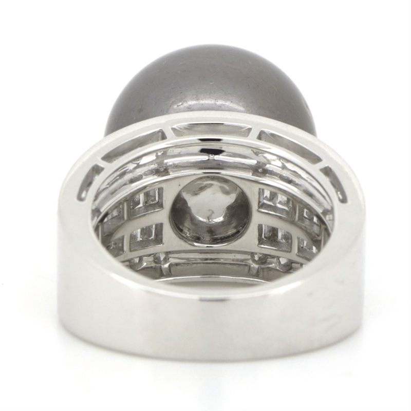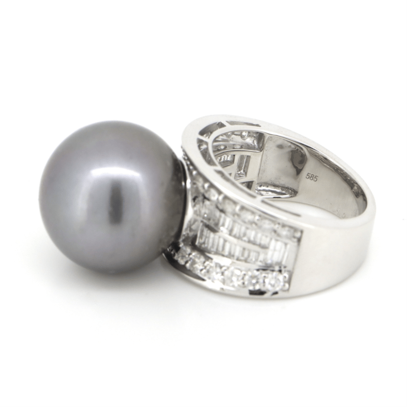 14K WHITE GOLD, GREY CULTURED TAHITIAN PEARL AND DIAMOND, COCKTAIL RING. The Centre Feature, One Round Grey With Silver Overtones, Cultured Tahitian Pearl (32.14Ct, 16.00Mm, Aa Lustre, Very Few Blemishes), Cap Set. Decorating The Band Are, 24 Round Brilliant Cut And 32 Baguette Cut, Diamonds (1.61Ct Tdw, G-H Colour, Si1-Si2 Clarity), Channel/Bead Set. Ring Size O. Condition: New. Valuations Provided by an Independent Third-Party Professional Not Directly Associated With Lloyds Auctions at AUD $$39,000.00This valuation has been conducted by an independent third-party professional. The valuation amount is an assessment by the issuing valuer and does not reflect the auction value of the item. Any inquiries regarding the valuation should be directed to the issuing valuer (refer to contact details on the certificate), as Lloyds Auctions has no affiliation or influence over the valuation, the valuer, or the stated amount. Condition: Good - Refer Images 0645940+5014