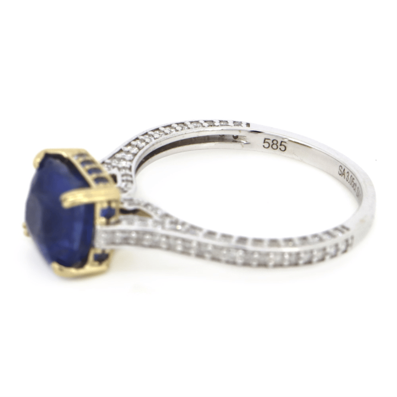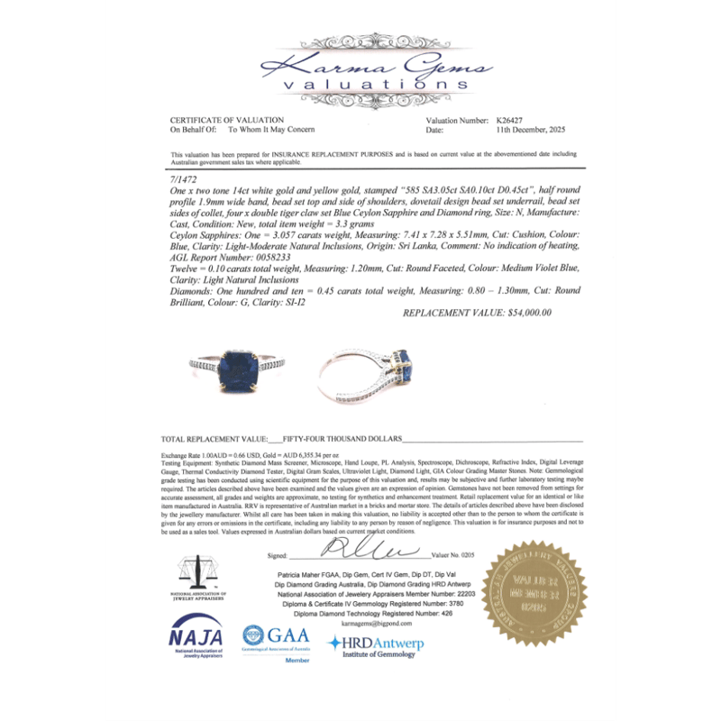 14K YELLOW/WHITE GOLD, CERTIFIED 3.057CT BLUE CEYLON SAPPHIRE AND DIAMOND, CLASSIC RING. The Centre Features, One Cushion Cut, Blue, Ceylon Sapphire (3.057Ct, Lightly Included, No Indication Of Heat Treatments, Agl Report No: 0058233), 4 Claw Set. Encompassing The Design Are, 12 Round Faceted Cut, Medium Violet-Blue, Sapphires (0.10Ct Tsw, Light Natural Inclusions), Dovetail Bead Set. Decorating The Band Are, 110 Round Brilliant Cut, Diamonds (0.45Ct Tdw, G Colour, Si-I2 Clarity), Bead Set. Ring Size N. Valuations Provided by an Independent Third-Party Professional Not Directly Associated With Lloyds Auctions at AUD $$54,000.00This valuation has been conducted by an independent third-party professional. The valuation amount is an assessment by the issuing valuer and does not reflect the auction value of the item. Any inquiries regarding the valuation should be directed to the issuing valuer (refer to contact details on the certificate), as Lloyds Auctions has no affiliation or influence over the valuation, the valuer, or the stated amount. Condition: Good - Refer Images 0645940+5021