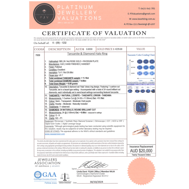 The Centre Features, One Cushion Cut, Moderate Vivid-Blue, Tanzanite (11.19Ct, Moderate Natural Inclusions), Bezel Set. Surrounding The Centre In A Halo Are, 24 Round Brilliant Cut, Diamonds (0.68Ct Tdw, G-H Colour, Si2-P1 Clarity), Semi-Bezel/Bead Set In White Gold. Ring Size N 1/2.