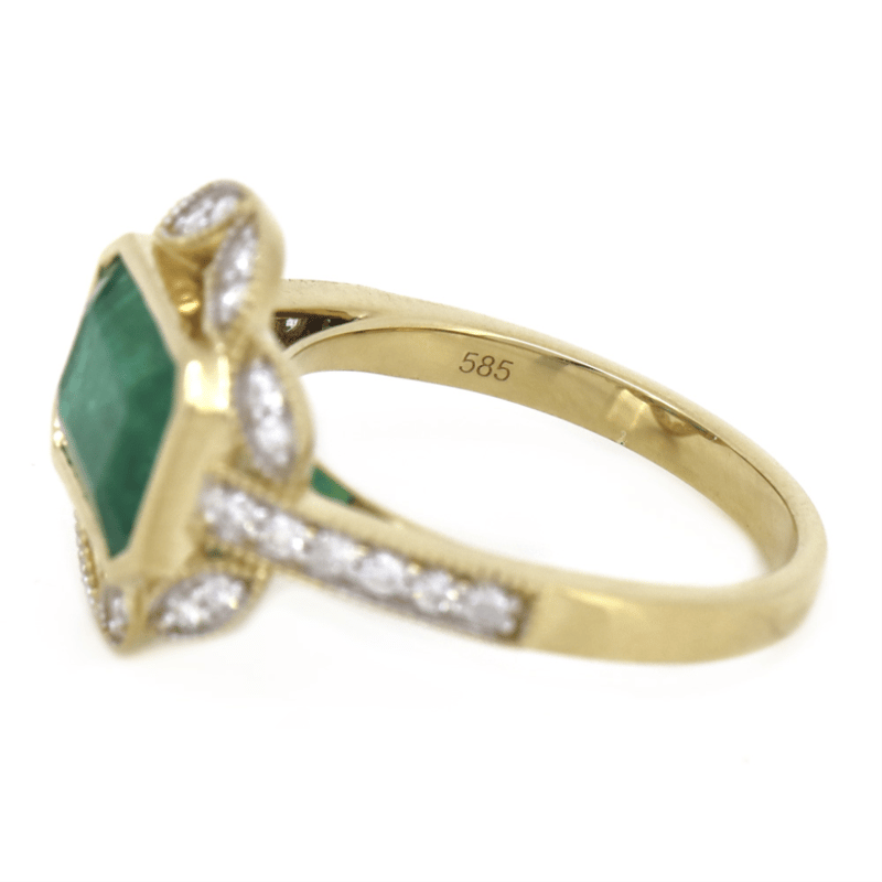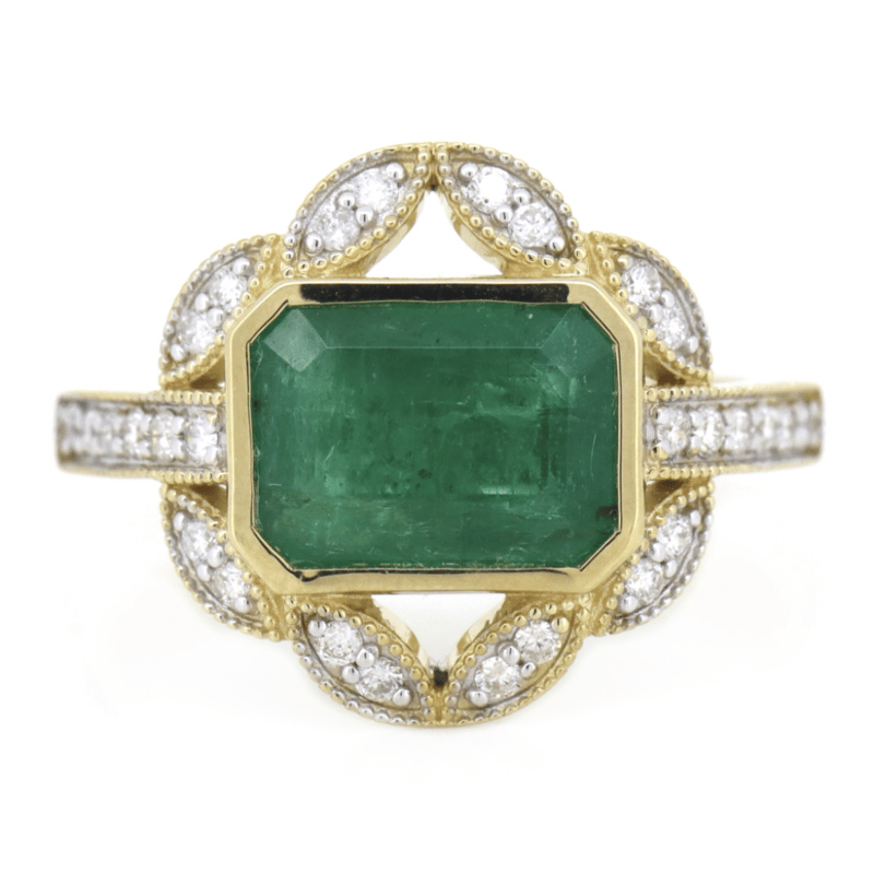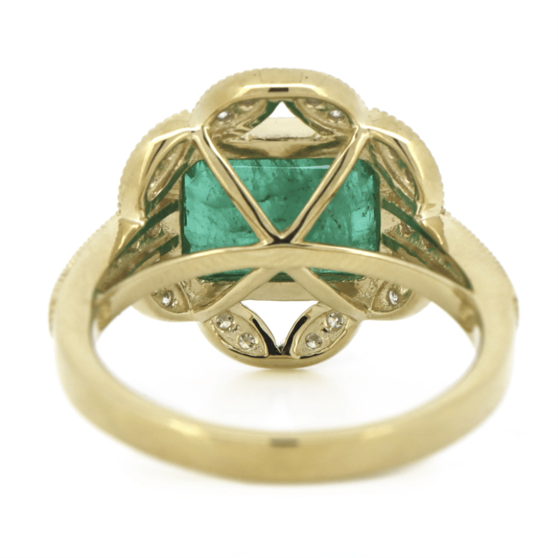 The Centre Features, One Emerald Cut, Medium-Dark Green, Emerald (3.01Ct, Moderate-Heavy Inclusions), Bezel Set. Embellishing The Design Are, 28 Round Brilliant Cut, Diamonds (0.32Ct Tdw, G-K Colour, Si-I2 Clarity), Bead Set. Ring Size N.
