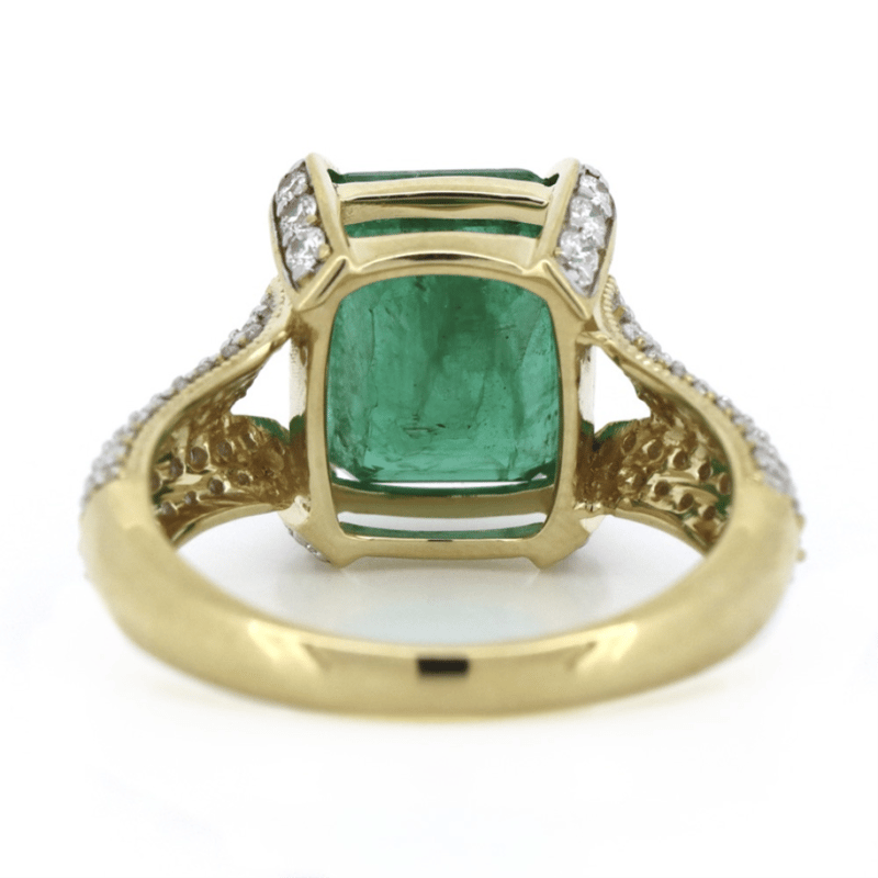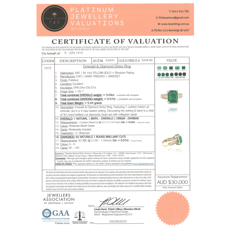 The Centre Features, One Cushion Cut, Moderate Bluish-Green, Zambian Emerald (5.04Ct, Moderate Inclusions), 4 Claw Set. Decorating The Band And Setting Are, 92 Round Brilliant Cut, Diamonds (0.57Ct Tdw, G-H Colour, Si1-Si2 Clarity), Bead Set With Millegrain Detail. Ring Size N 1/2.