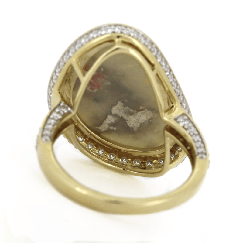 14K YELLOW GOLD, 5.07CT LIGHTNING RIDGE OPAL AND DIAMOND, HALO RING.
