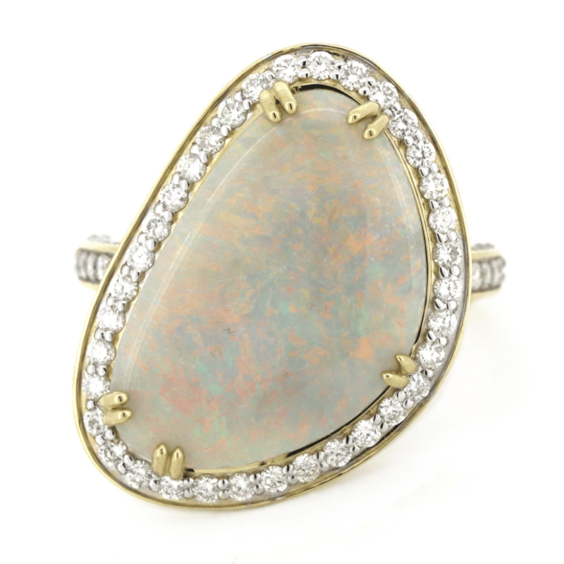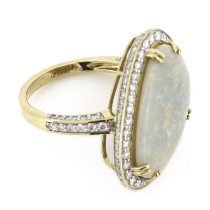 The Centre Features, Free-Form Cabochon Cut, Lightning Ridge Opal (5.07Ct, Red, Orange, Yellow, Green, Blue And Purple Colour Play, Floral Broadflash Pattern), Claw Set. Surrounding The Centre In A Halo And Decorating Shoulders Are 124 Round Brilliant Cut Diamonds (1.01Ct Tdw, H-J Colour, Si1-I2+Clarity), Bead Set. Ring Size: O.