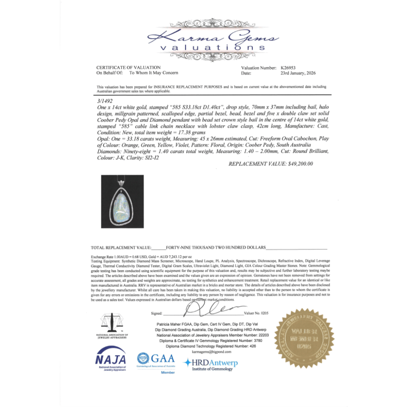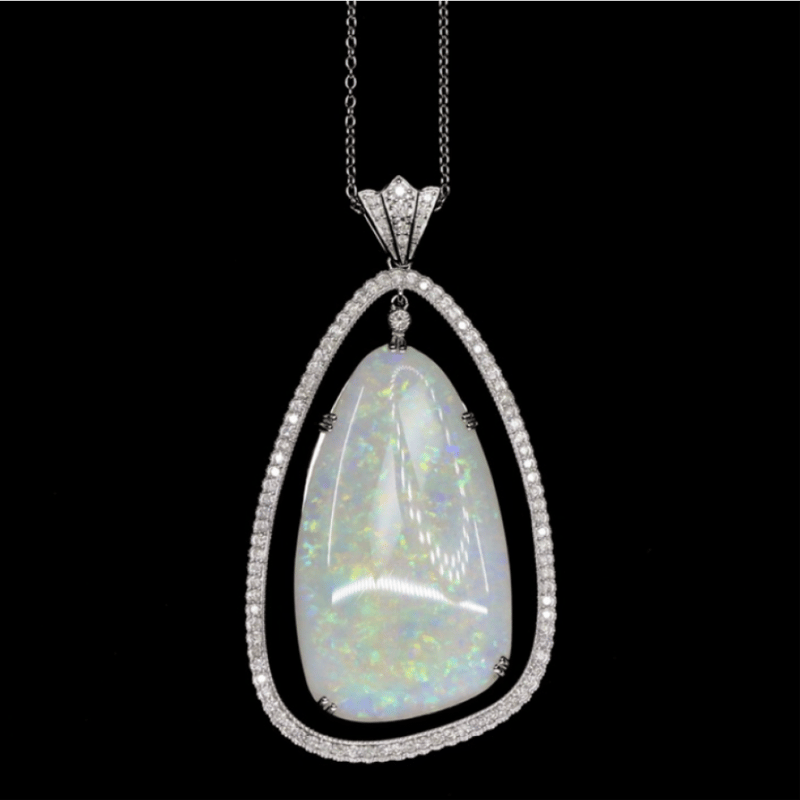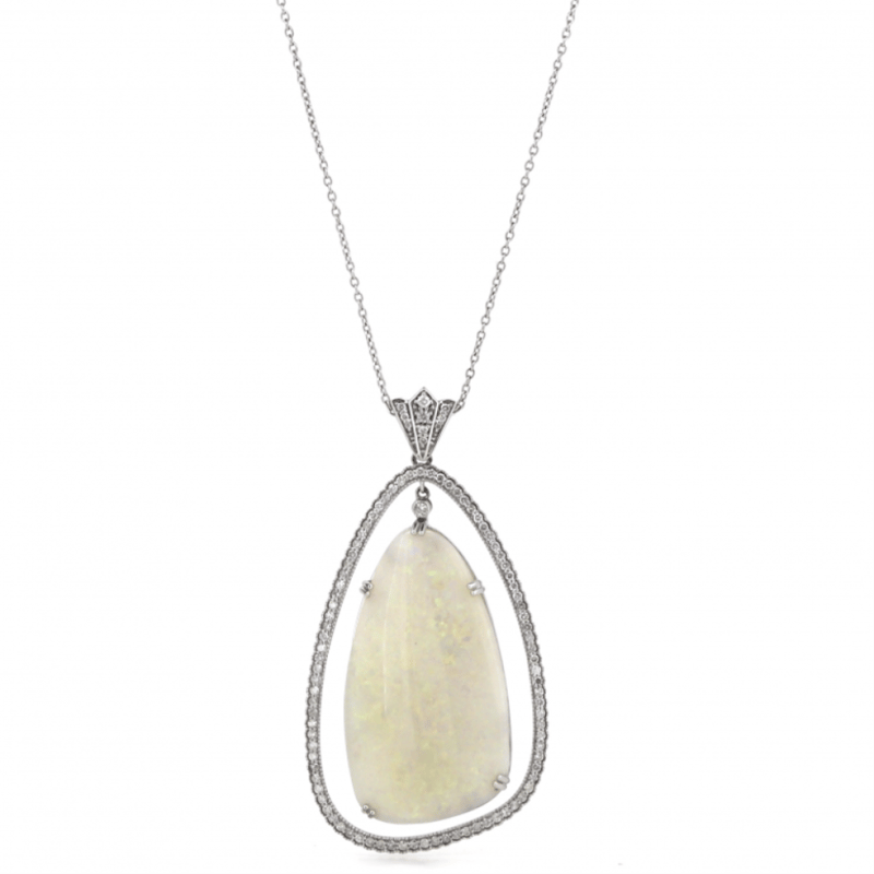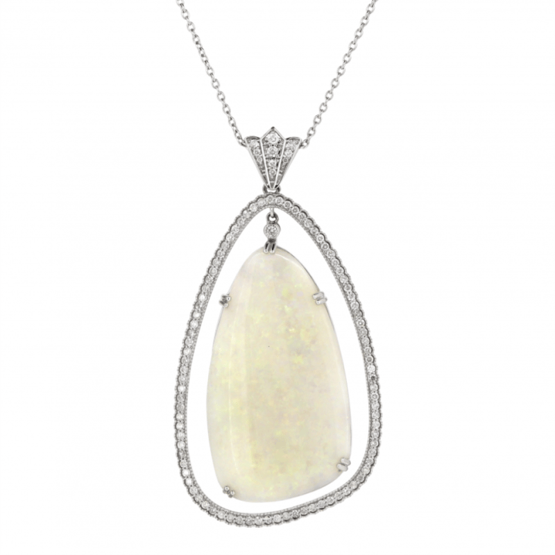 The Central Design Features, One Cabochon Cut, Orange, Green, Yellow, Violet Moderate Colour Play, Coober Pedy Opal (33.18Ct), 4 Claw Set. Surrounding The Centre Opal Are, 98 Round Brilliant Cut, Diamonds (1.40Ct Tdw, J-K Colour, Si2-I2 Clarity), Bead/Bezel Set. The Necklace Has A Lobster Claw Clasp Closure. The Necklace Is A Curb Link Chain And Measures 42Cm.