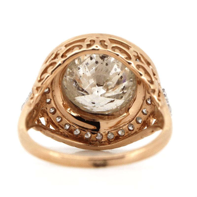 14K ROSE GOLD AND DIAMOND, HALO RING. The Centre Features, One Round Brilliant Cut, Diamond (4.12Ct, M Colour, P3 Clarity), Bezel Set. Surrounding The Centre In A Halo And Decorating The Shoulders Are, 36 Round Brilliant Cut, Diamonds (0.41Ct Tdw, I-K Colour, P1+ Clarity), Bead Set. Ring Size M. Valuations Provided by an Independent Third-Party Professional Not Directly Associated With Lloyds Auctions at AUD $$98,400.00This valuation has been conducted by an independent third-party professional. The valuation amount is an assessment by the issuing valuer and does not reflect the auction value of the item. Any inquiries regarding the valuation should be directed to the issuing valuer (refer to contact details on the certificate), as Lloyds Auctions has no affiliation or influence over the valuation, the valuer, or the stated amount. Condition: Good - Refer Images 0645940+5029