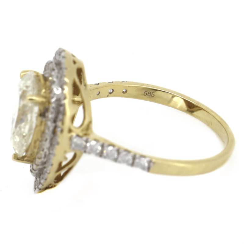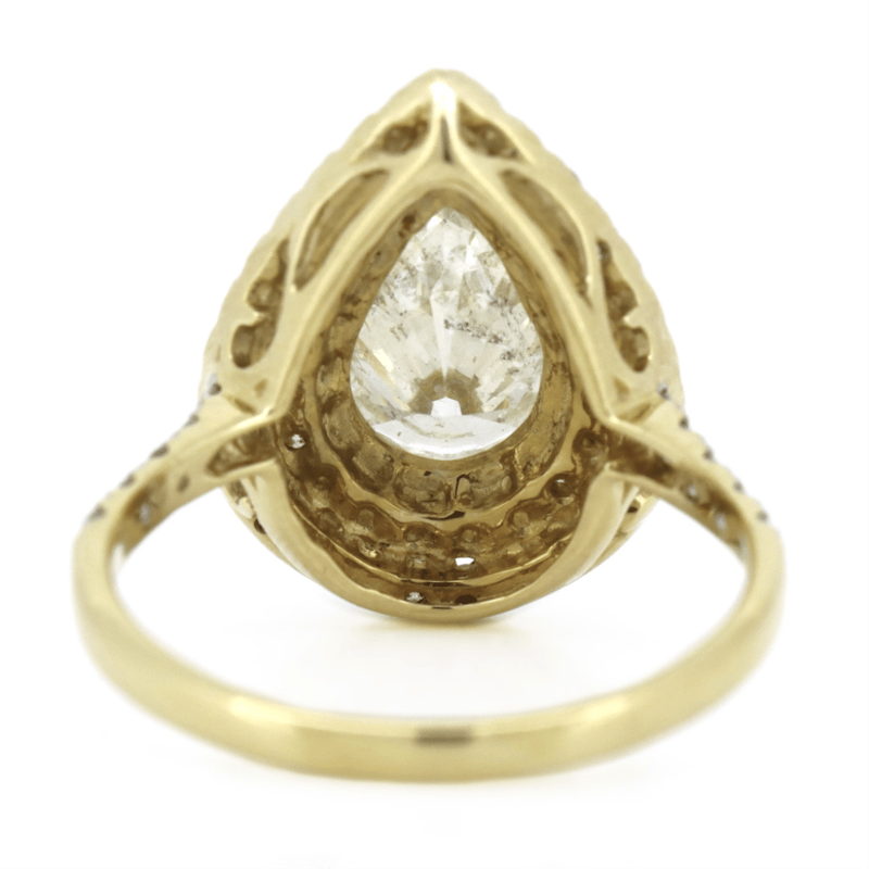 14K YELLOW GOLD, FANCY YELLOW DIAMOND, DOUBLE HALO RING. The Centre Features, One Pear Modified Brilliant Cut, Light Fancy Yellow, Diamond (2.21Ct, P1 Clarity), Claw Set. Surrounding The Centre In A Double Halo And Decorating The Band Are, 58 Round Brilliant Cut, Diamonds (0.66Ct Tdw, H-K Colour, P1+ Clarity), Bead Set. The Ring Has Been 14K White Gold Rhodium Plated, To Achieve A Two-Tone Effect. Ring Size N. Valuations Provided by an Independent Third-Party Professional Not Directly Associated With Lloyds Auctions at AUD $$79,400.00This valuation has been conducted by an independent third-party professional. The valuation amount is an assessment by the issuing valuer and does not reflect the auction value of the item. Any inquiries regarding the valuation should be directed to the issuing valuer (refer to contact details on the certificate), as Lloyds Auctions has no affiliation or influence over the valuation, the valuer, or the stated amount. Condition: Good - Refer Images 0645940+5035