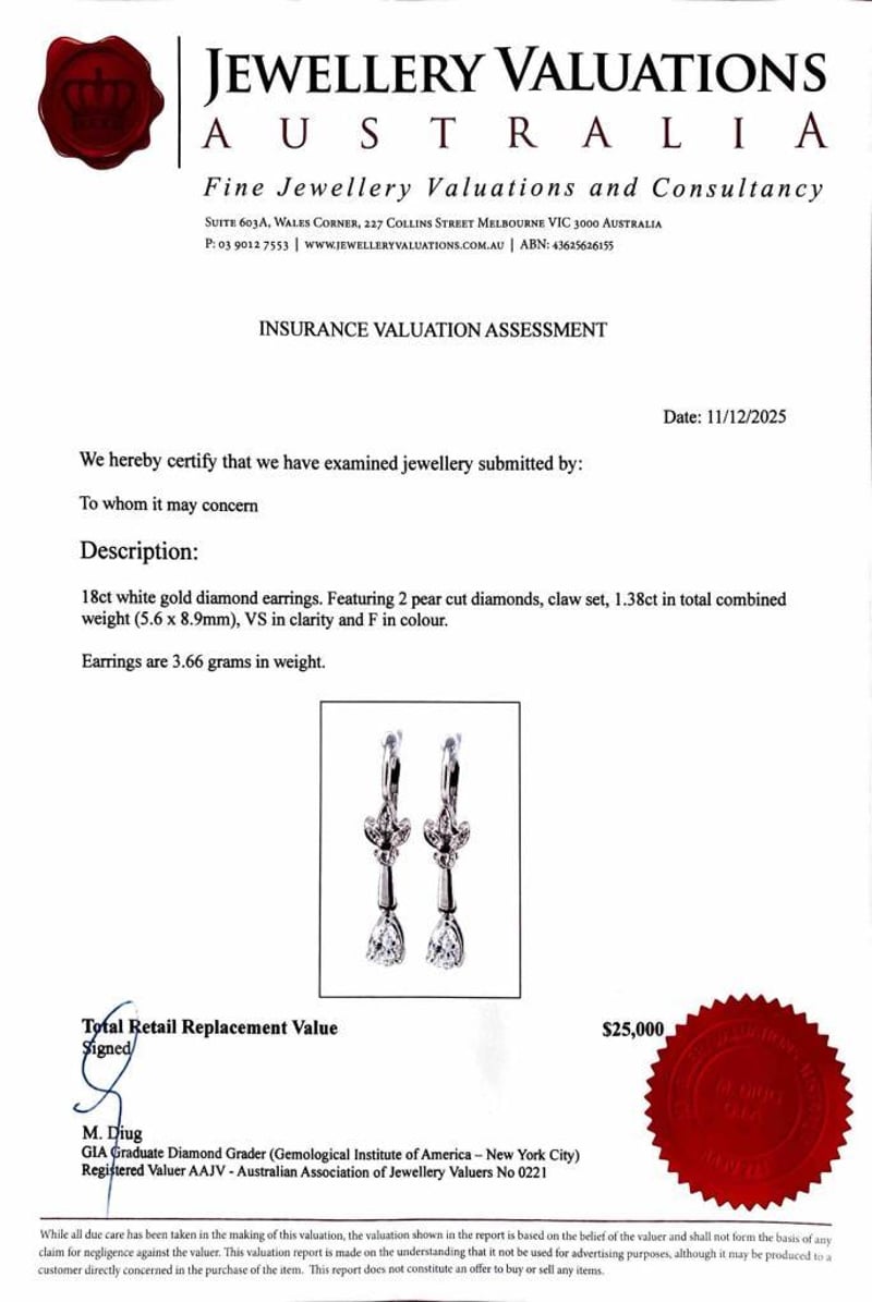 Featuring 2 Pear Cut Diamonds, Claw Set, 1.38Ct In Total Combined Weight (5.6 X 8.9Mm), Vs In Clarity And F In Colour.