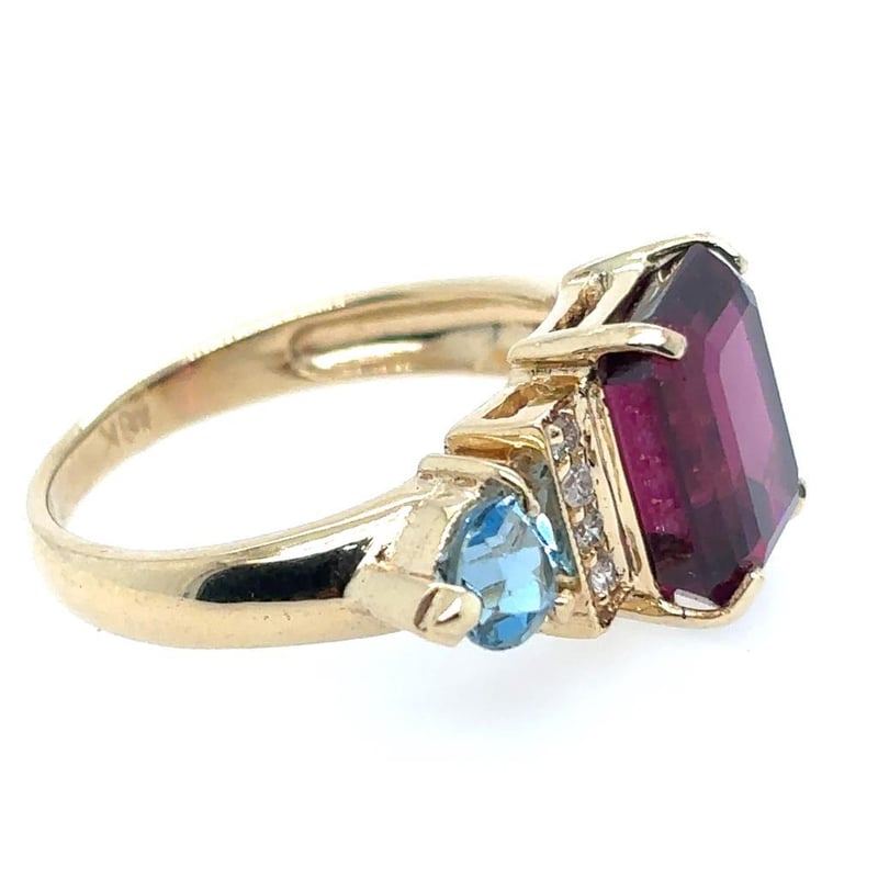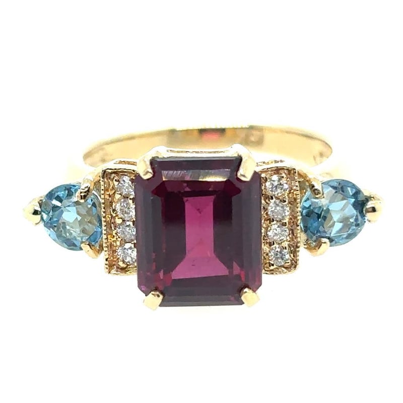 18CT YELLOW GOLD GARNET, AQUAMARINE AND DIAMOND RINGFeaturing An Emerald Cut Rhodolite Garnet, Claw Set, 5.55Ct In Weight (10.0 X 8.0Mm), And Reddish Purple In Colour. 2 Round Cut Aquamarines, Claw Set, 0.90Ct In Total Combined Weight (4.6 Mm), And Blue In Colour. 8 Round Brilliant Cut Diamonds, Claw Set, 0.25Ct In Total Combined Weight, Si In Clarity And G In Colour.Finger Size N.Total Item Weight: 5.46gCondition: Good - Refer To ImagesThis valuation has been conducted by an independent third-party professional. The valuation amount is an assessment by the issuing valuer and does not reflect the auction value of the item.Any inquiries regarding the valuation should be directed to the issuing valuer (refer to contact details on the certificate), as Lloyds Auctions has no affiliation or influence over the valuation, the valuer, or the stated amount.Insurance Replacement Valuation Amount: $24,980.00163082+18