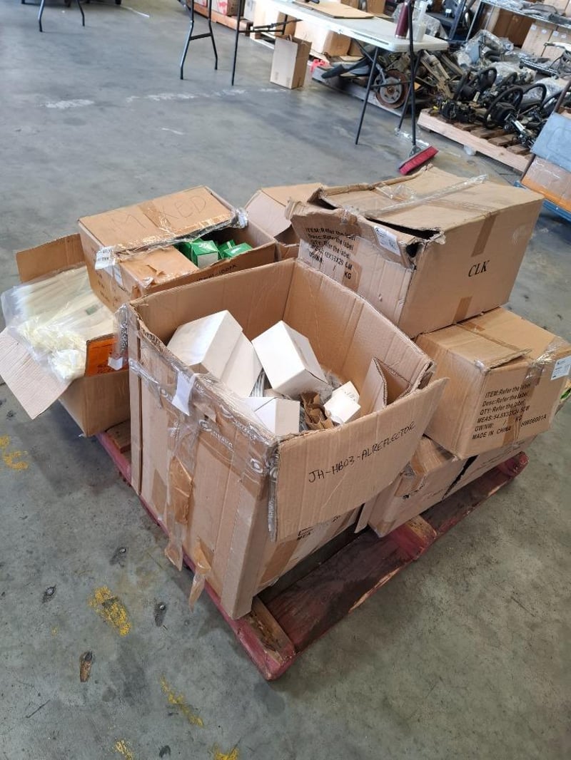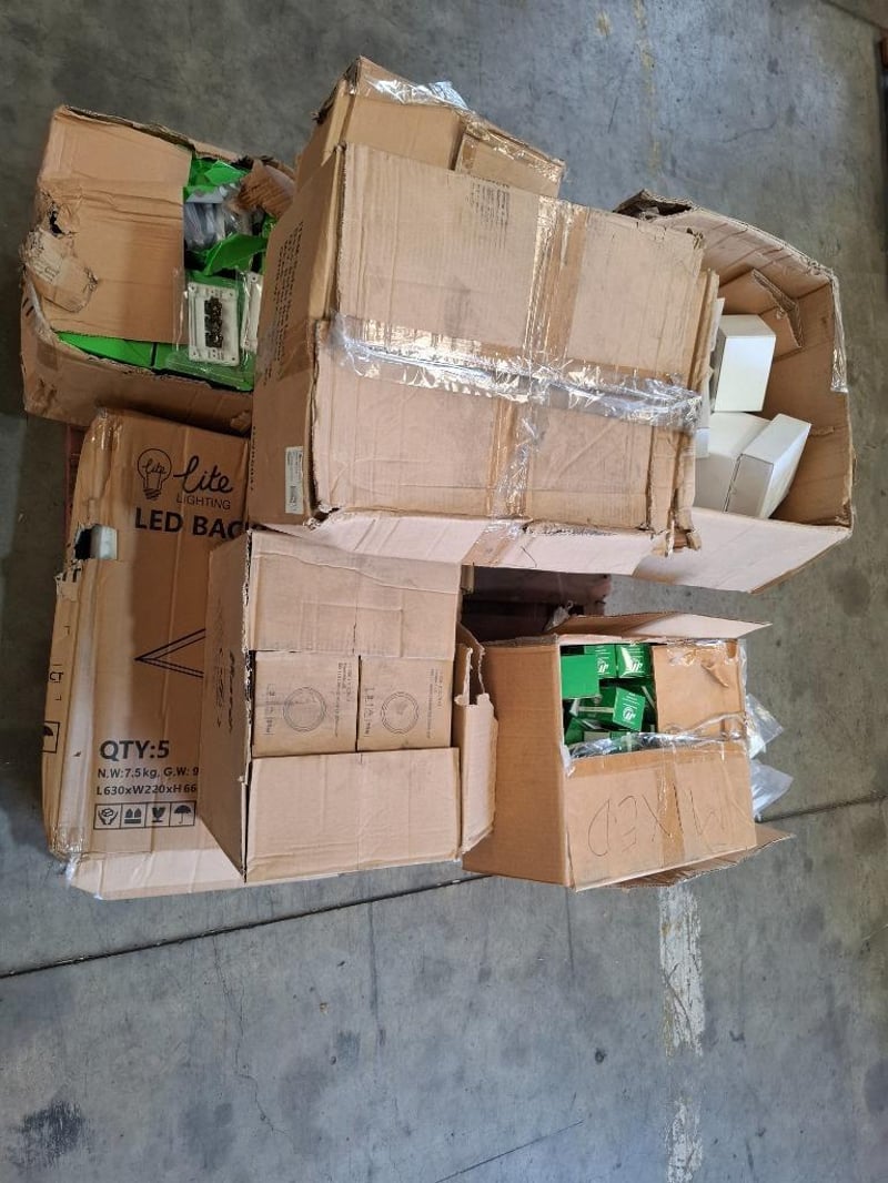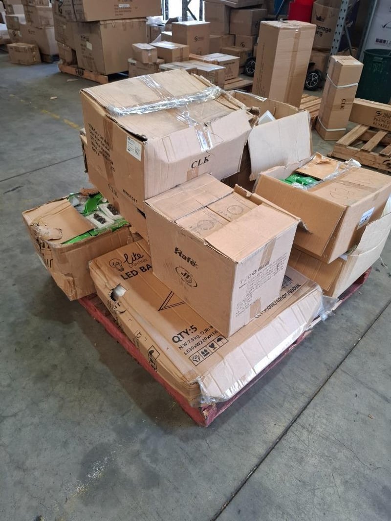 Assorted Pallet Of Electrical Components Consisting Of Lights, Switches, Switch Plates, And Plugs.Models Include:CS-CGD-LC1517R-01-5000BKISOLM116LG-10WJHNote: Contents Sold Together As One Lot.Inspection Recommended Prior To Bidding.