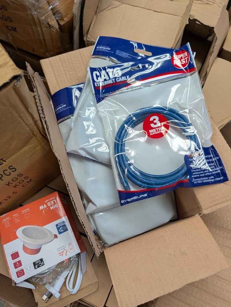 Assorted Pallet Of Electrical Components Consisting Of Lights, Ethernet Cables, Zip Ties And More