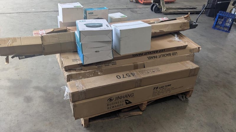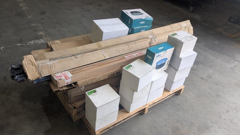 Assorted Pallet Of Electrical Components Consisting Of Lights, Switches, Switch Plates, And Plugs.Models Include:CS-LL-PL03-60120ND-55W-CCTJH-SWL2-V2-24W-MICCS-KES-MD2510-36WNote: Contents Sold Together As One Lot.Inspection Recommended Prior To Bidding.