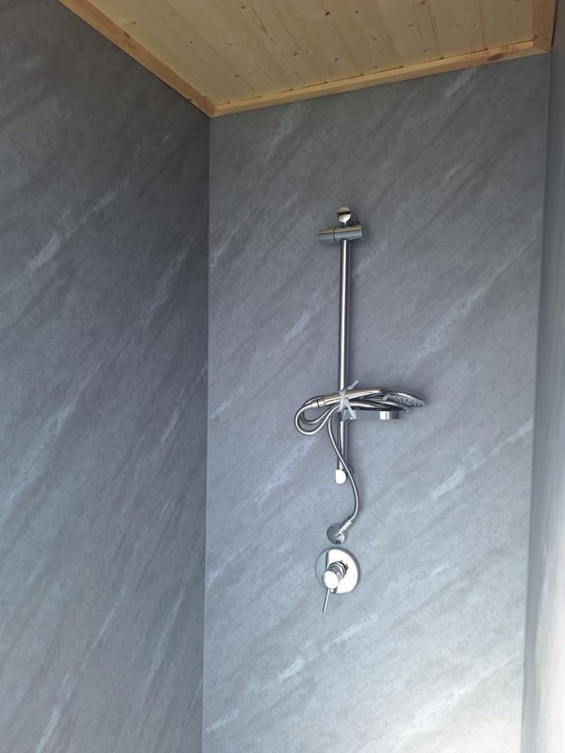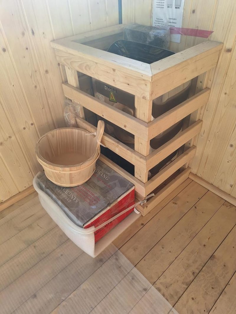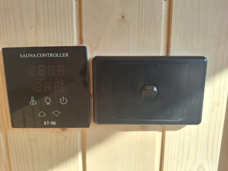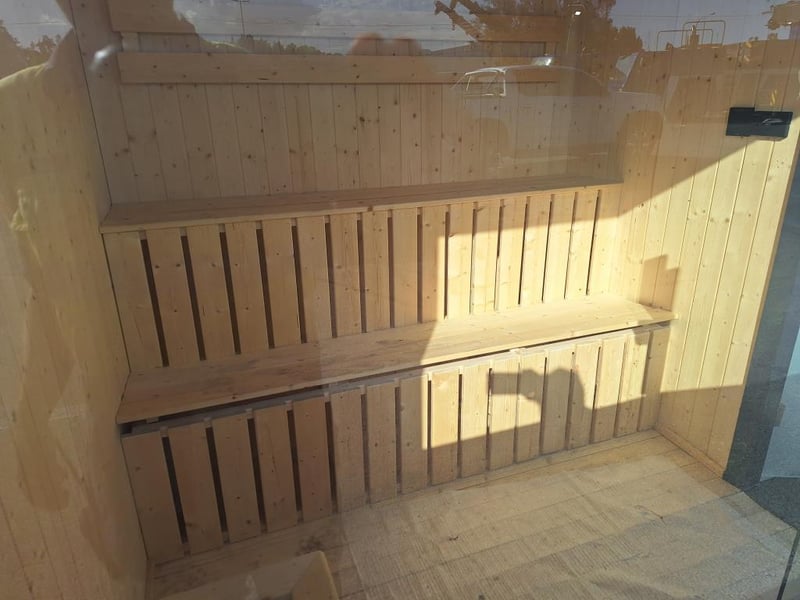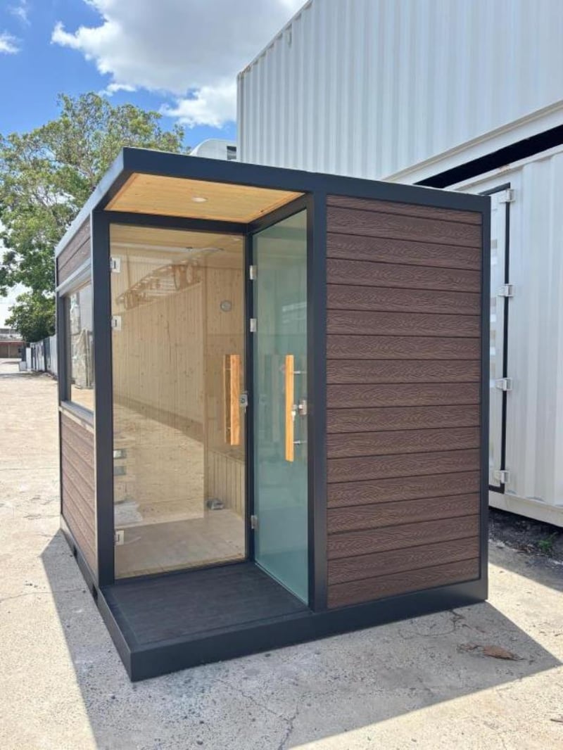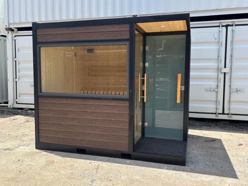 Portable Sauna Block with Shower, Includes Glass Front Window, And Lockable Glass Door With Wooden Handle, Includes 2-Tier Seating, Down Lights, Temperature Gauge, Digital Sauna Controller, Dooist Sauna Heater And 1 x Carton Sangwang Sauna Stones, Shower Includes Frosted Glass Door, Downlight, Shower Fixtures, Exterior Forklift Sockets, 4 x Roof Lifting Points