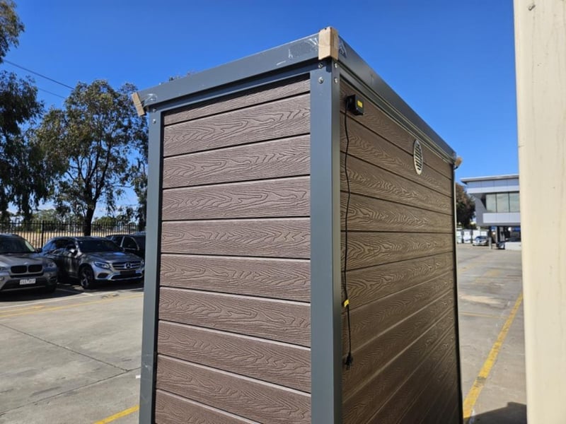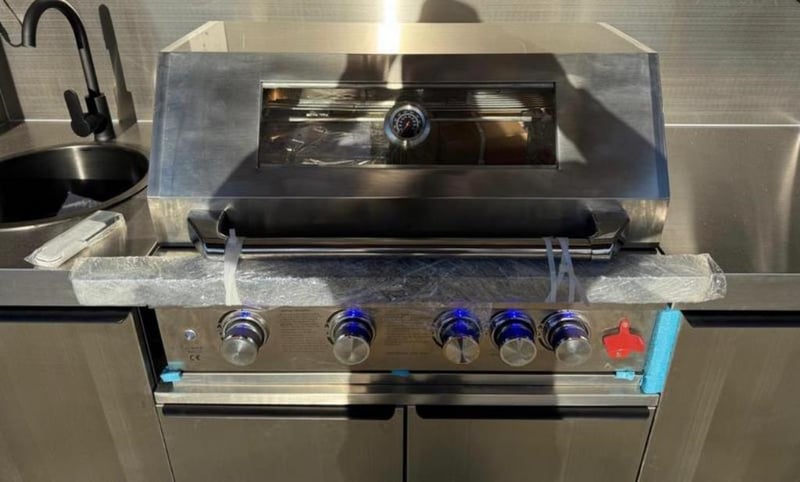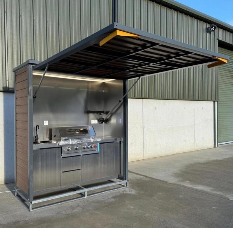 7FT BBQ House Description: Stainless Steel Panel interior wall. Electrical door, Speakers, range hoods, refrigerators