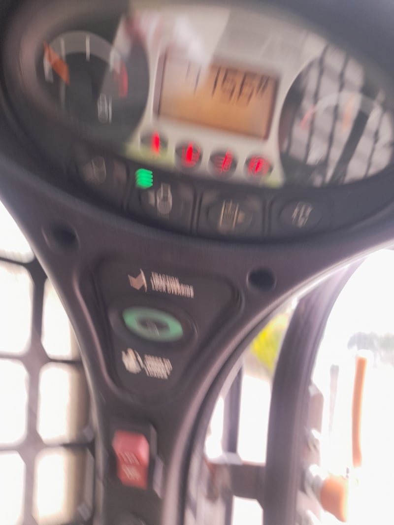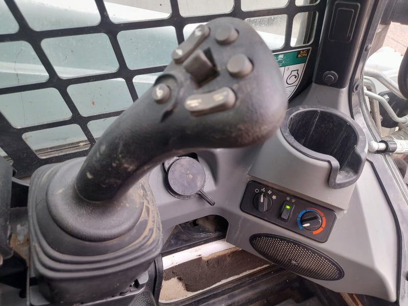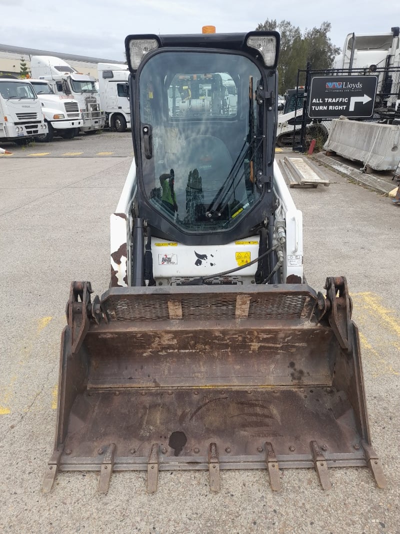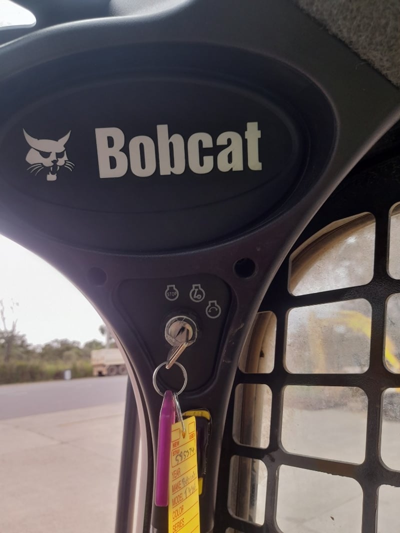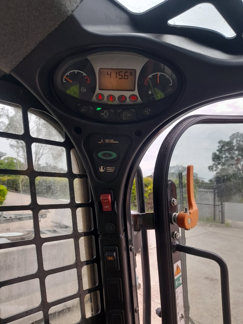 Description: bobcat skid steer loader in working condition, rubber tracks, 4 cyclinder diesel engine, 4 in 1 bucket ,air con cab, fire extinguisher, amber light