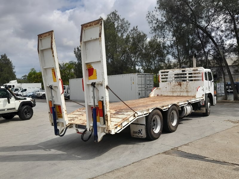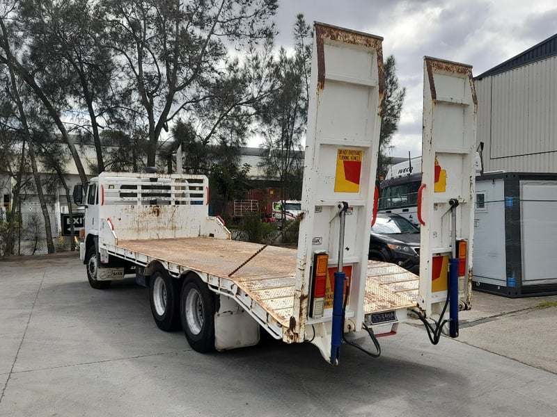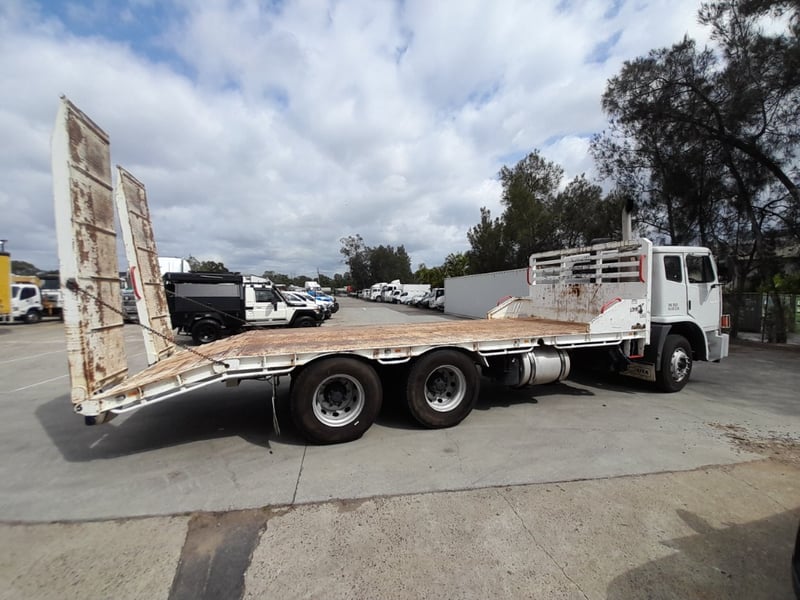 Description: work condition tow truck with dove tail hydraulic ramps, has air leak and struggles to keep brakes off, power windows, air con, air ride seating