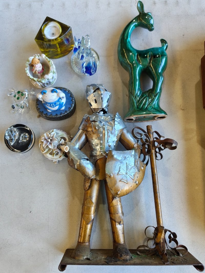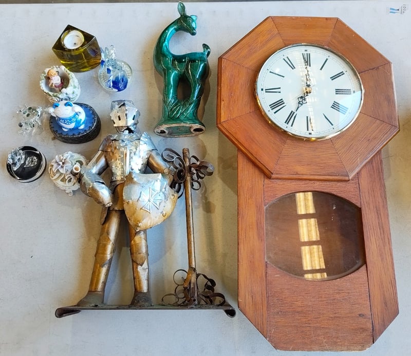Assorted lot of items, including wooden clock and glass trinketsNote: clock may be missing parts