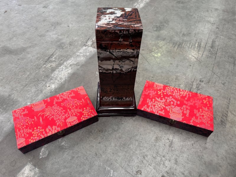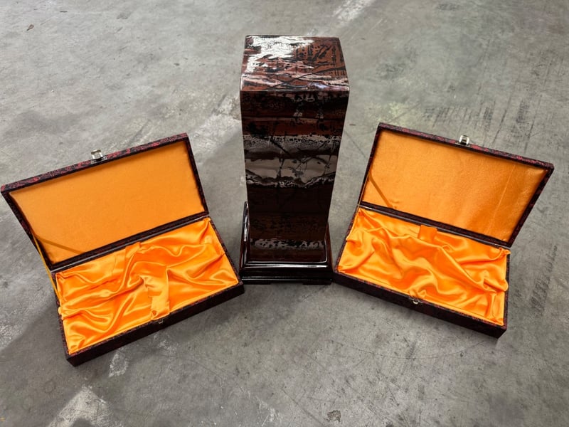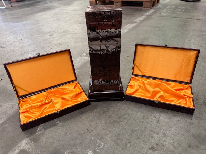 Polished dendritic limestone tower with two padded boxes