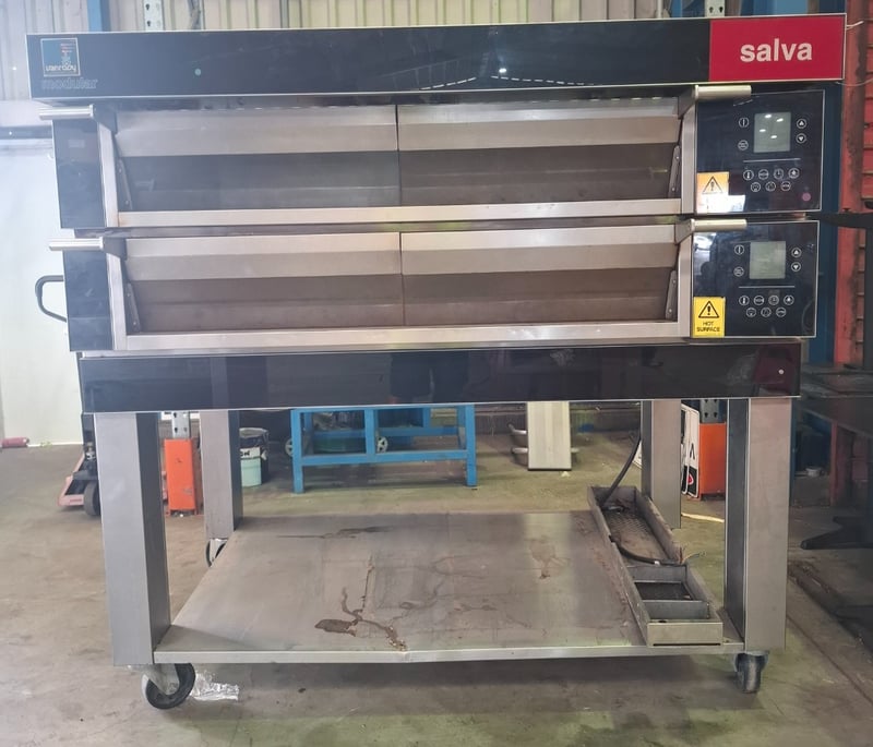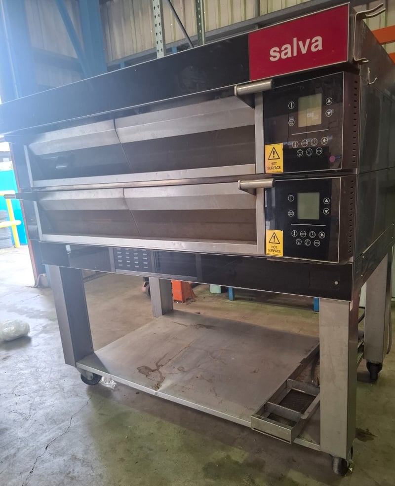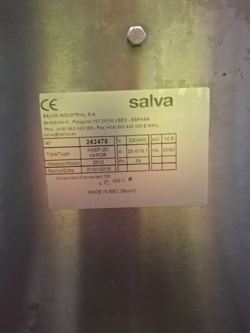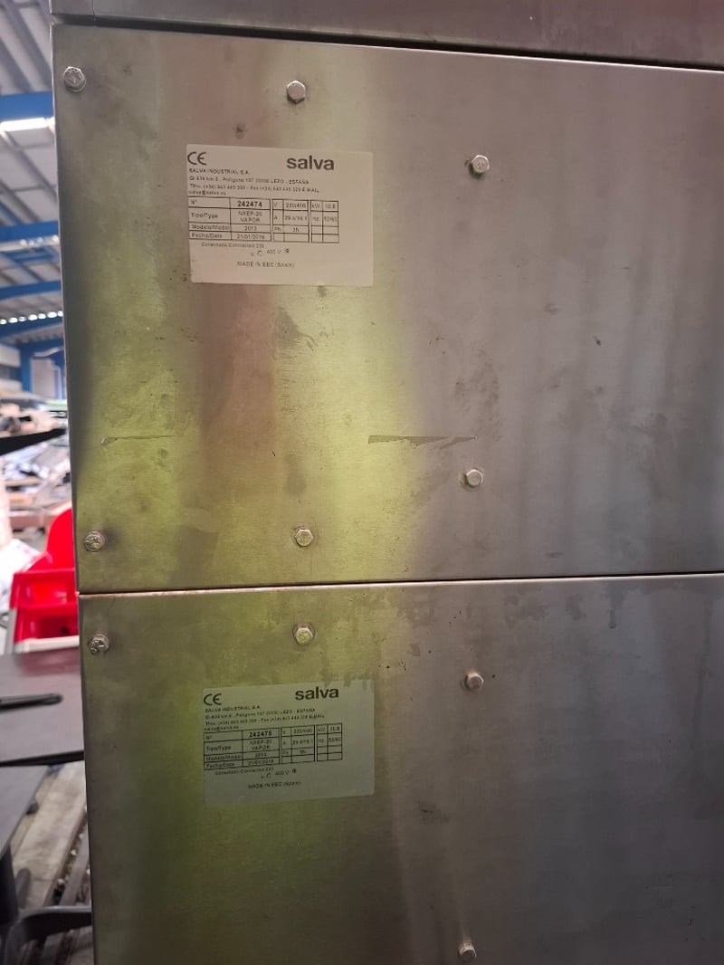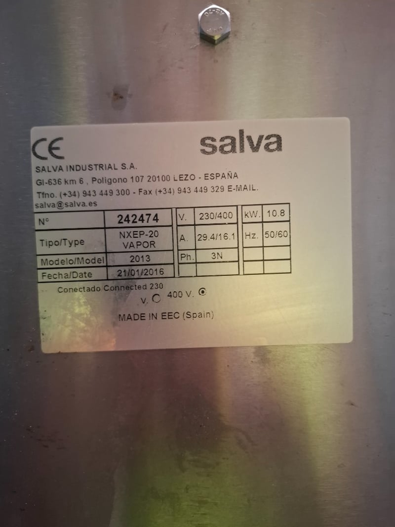 Salva NXEP-20 VAPOR Deck ovens. Independent modules allow different types of products to be cooked in each module.Handmade ceramic heating elements for exceptional heat transfer.Energy-efficient, unique heat distribution system.Designed for 3 trays per deck for efficient baking output.On castors for easy movement and positioning.Available in one to five decks, allowing for future expansion.Optional steam units and stone floors are available for each deck.Optional setter-loaders available, including manual, column and integrated options.Future Control Panel with intuitive digital interface.150 programs per deck for precise baking control.Three independent control zones: Opening, Ceiling and Floor.Pictogram library incorporated for easy operation.Programmable motorised draft for optimised air circulation.Note: Cleaning Required. Model: NXEP-20 VAPOR.Serial: 2013Build date: 21/01/2016Dimensions L 191 cm x H 107 cm x D 136 cmInspection Recommended.