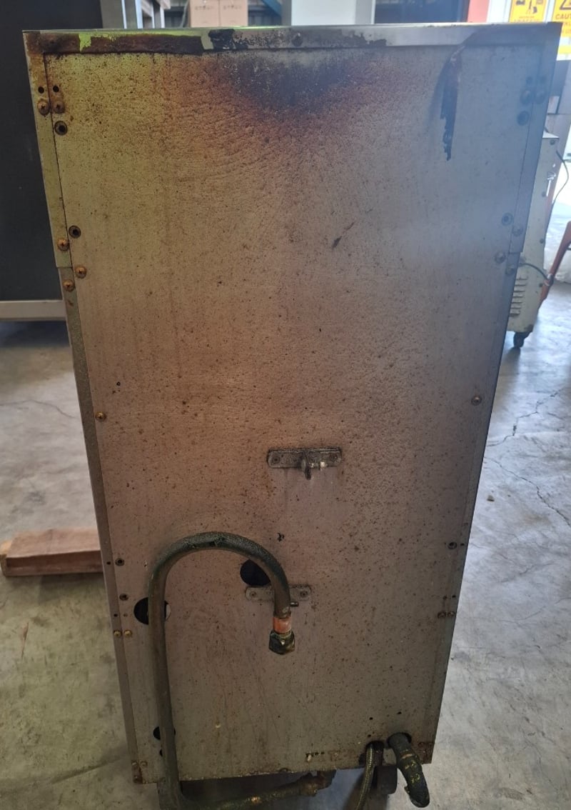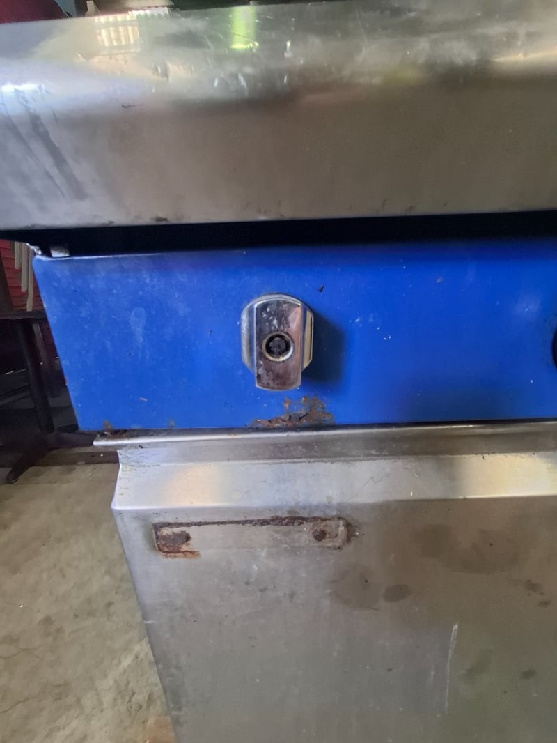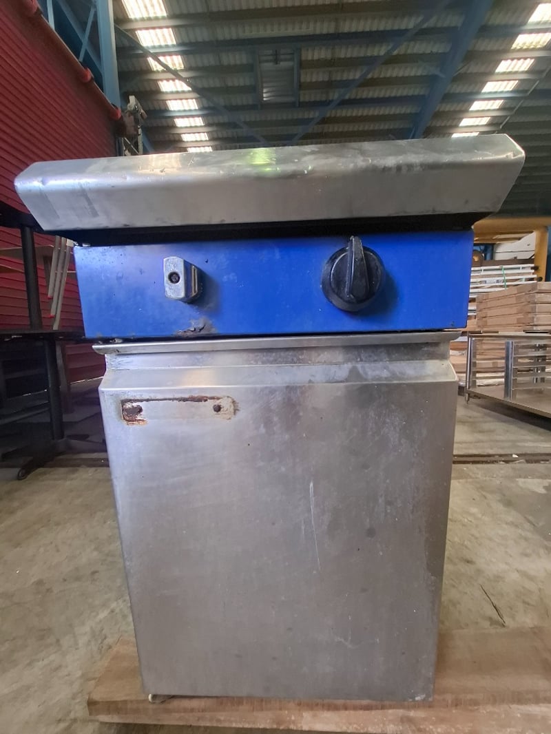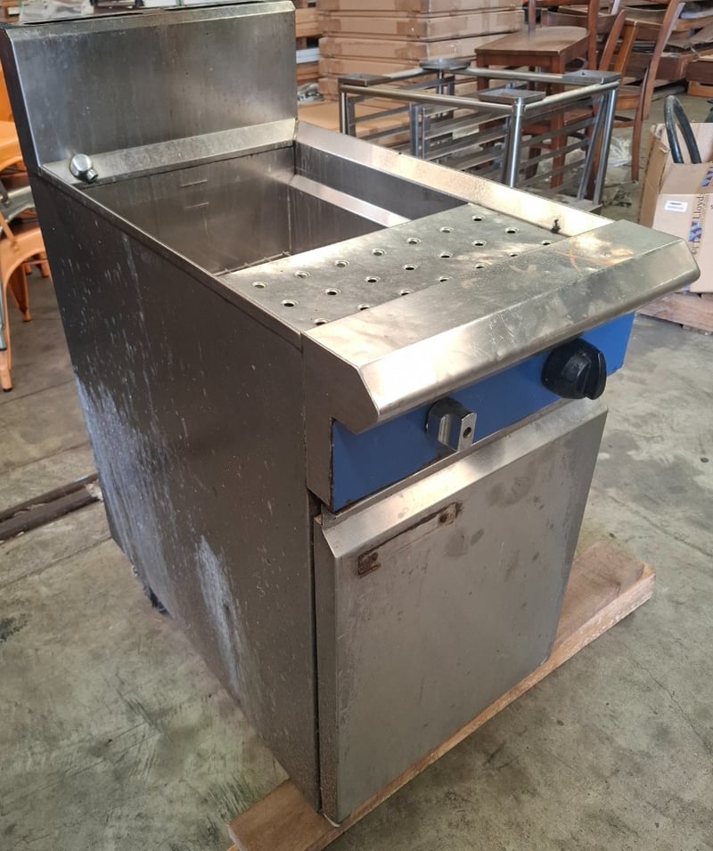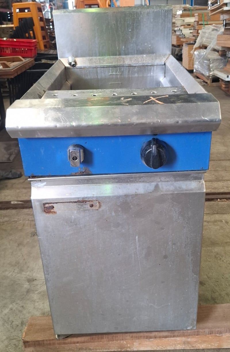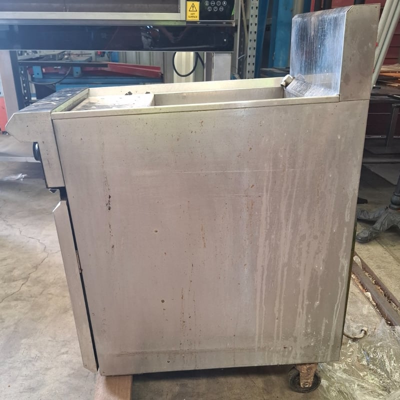 Blue Seal Evolution Series G47 450mm single pan gas pasta cooker. It has a 40-litre water capacity. The unit features a high-performance 47 MJ/hr infrared burner system. It is designed for continuous production of pasta with fast recovery times. The pan is made from easy-clean 316 grade stainless steel. Cleaning required.Note: missing one front leg and one dial knob, scuffs, scratches and marks on surfaces, some rust were plate used to be.Dimensions: H 109 cm x L 45 cm x D 81 cmInspection Highly Recommended.