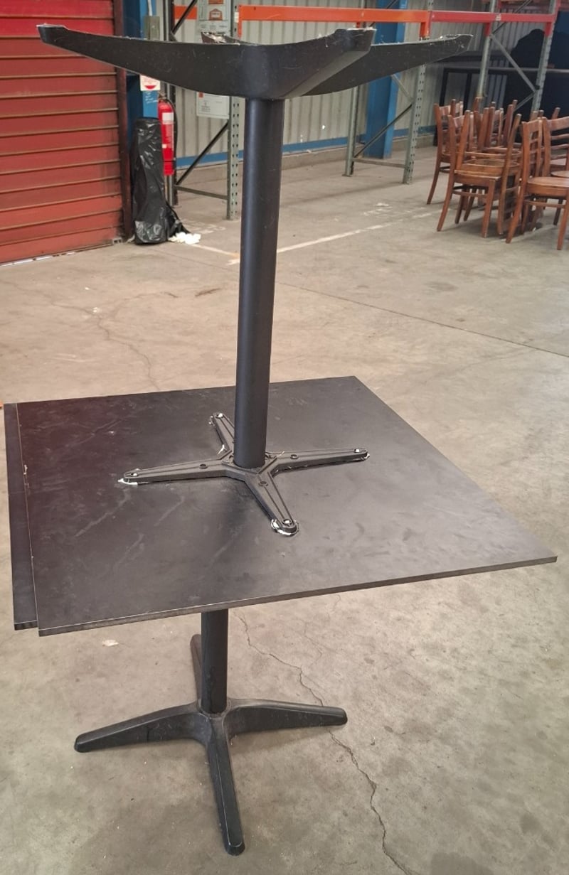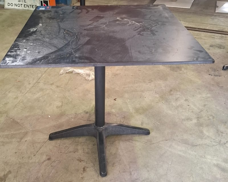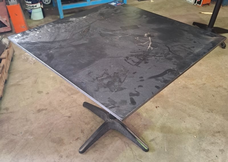 2 x 4 seat café style table, black top and metal base, minor scuffs scratches and marks.