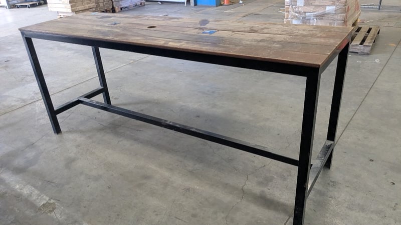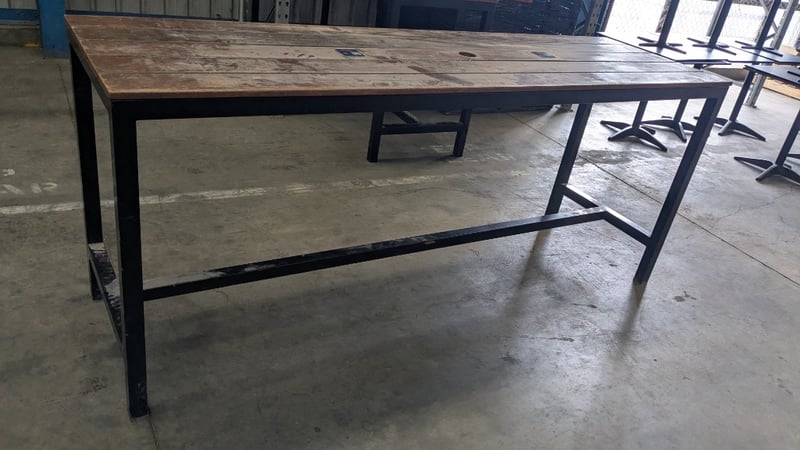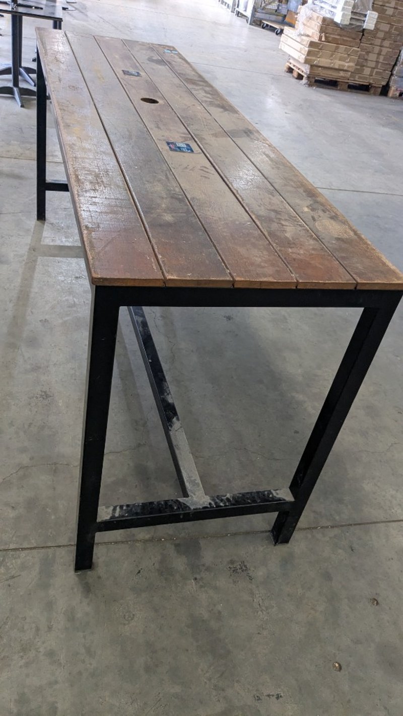 Outdoor Bar Table, Metal Frame, Medium Stained Timber TopDimensions: 2410mm(L) x 720mm(D) x 1020mm(H) NOTE: INSPECTIONS HIGHLY RECOMMENDED