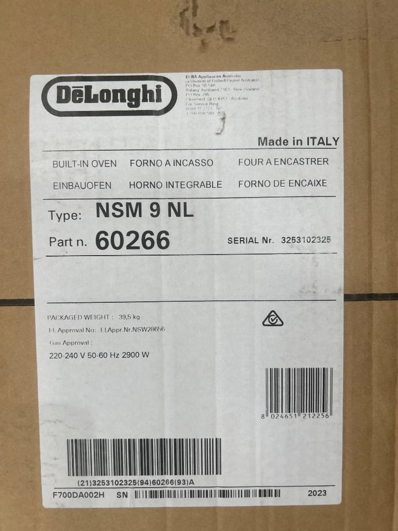 RRP; $941, DeLonghi 60cm 9 Function Built-In Life Oven, Model; NSM 9 NL, 85L Gross capacity, 7 shelf levels Dimensions approx; 595H x 595W x 566D mm