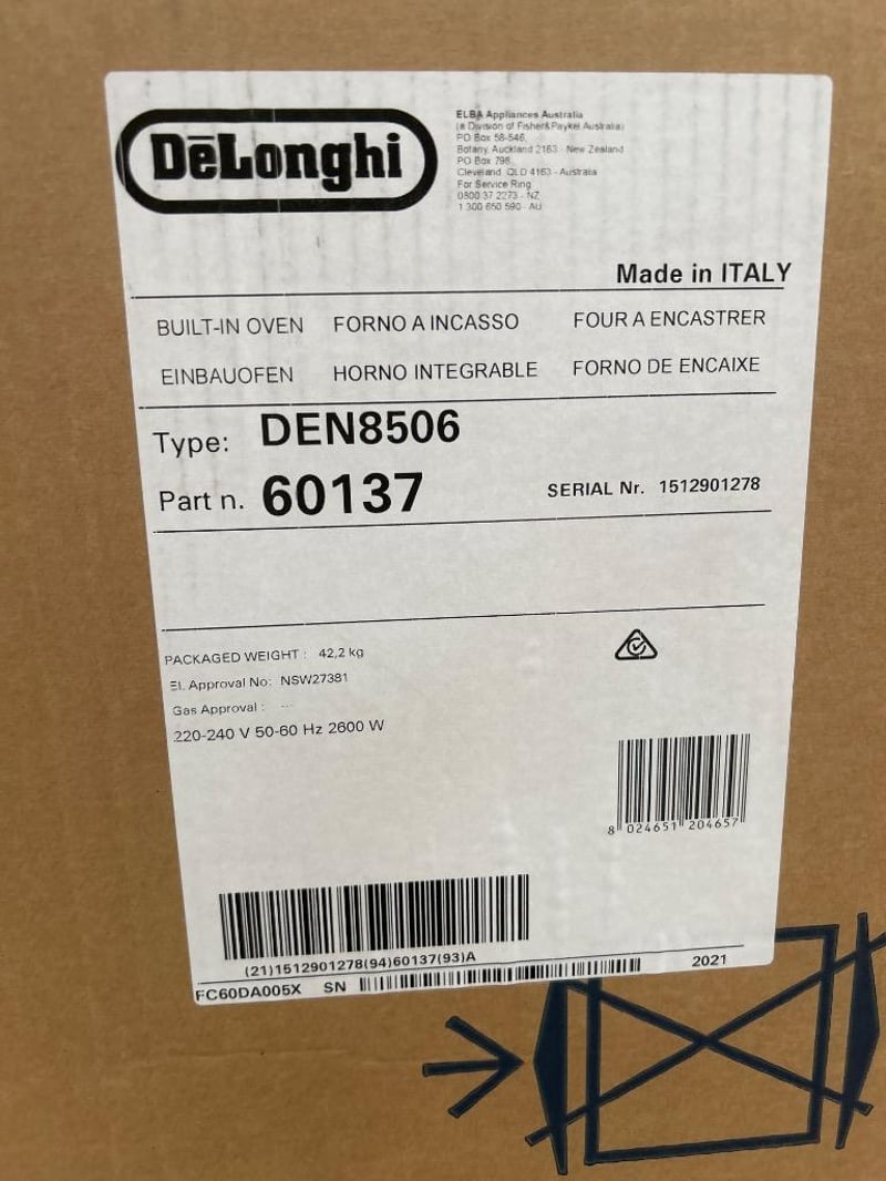 RRP; $488, Delonghi 60cm Built In XXL Lifestyle Multi Function Oven, model; DEN8506, stainless steel finish dimensions approx; H595 x W595 x D565 mm